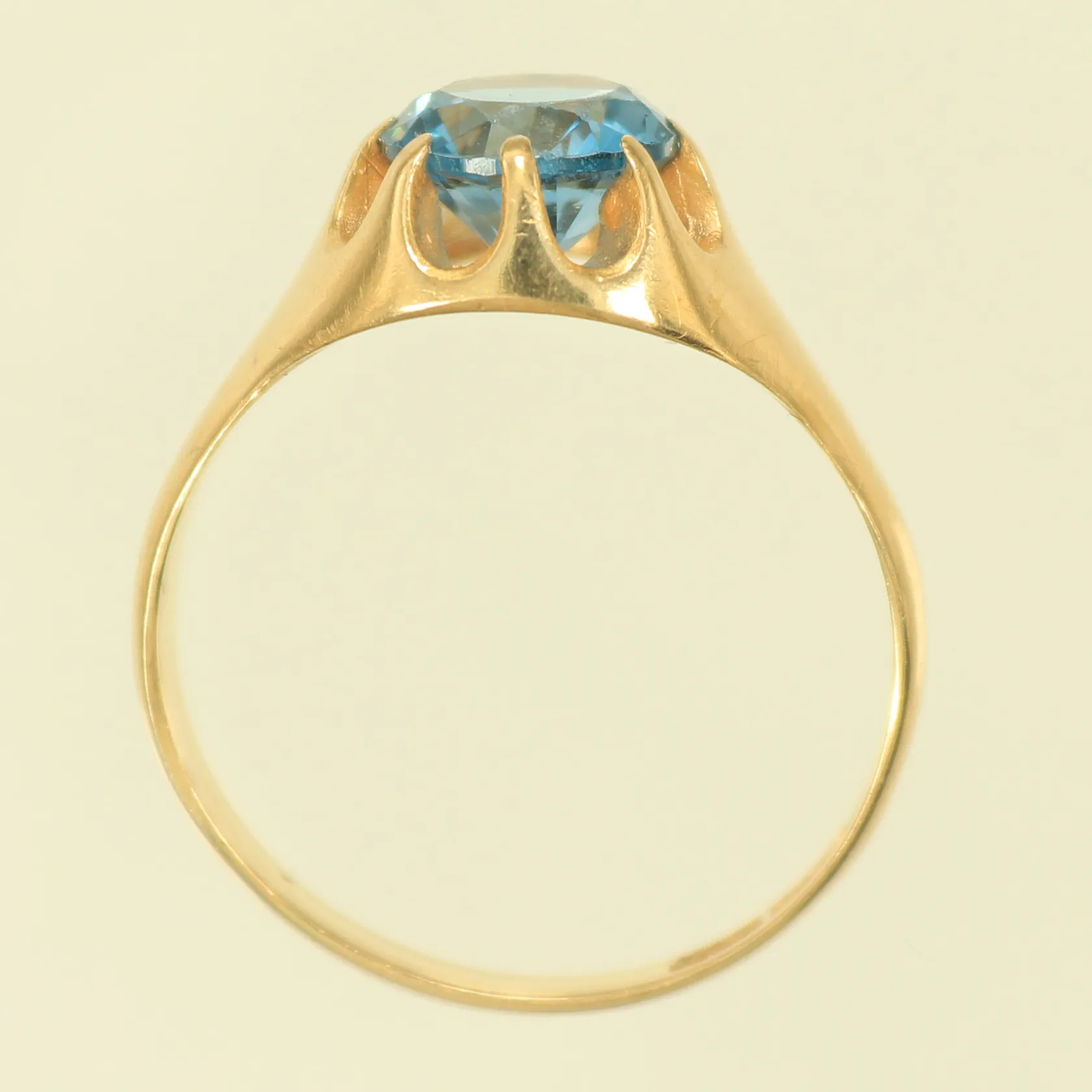 Ring med ljusblå sten stl 19½, bredd 3,5-10mm, 18K, 5,2g bruttovikt Vikt: 5,2 g.