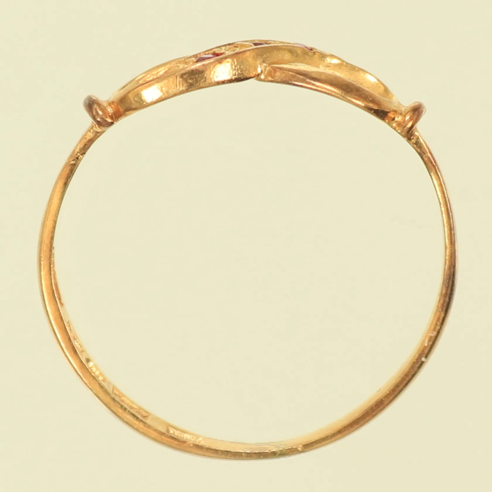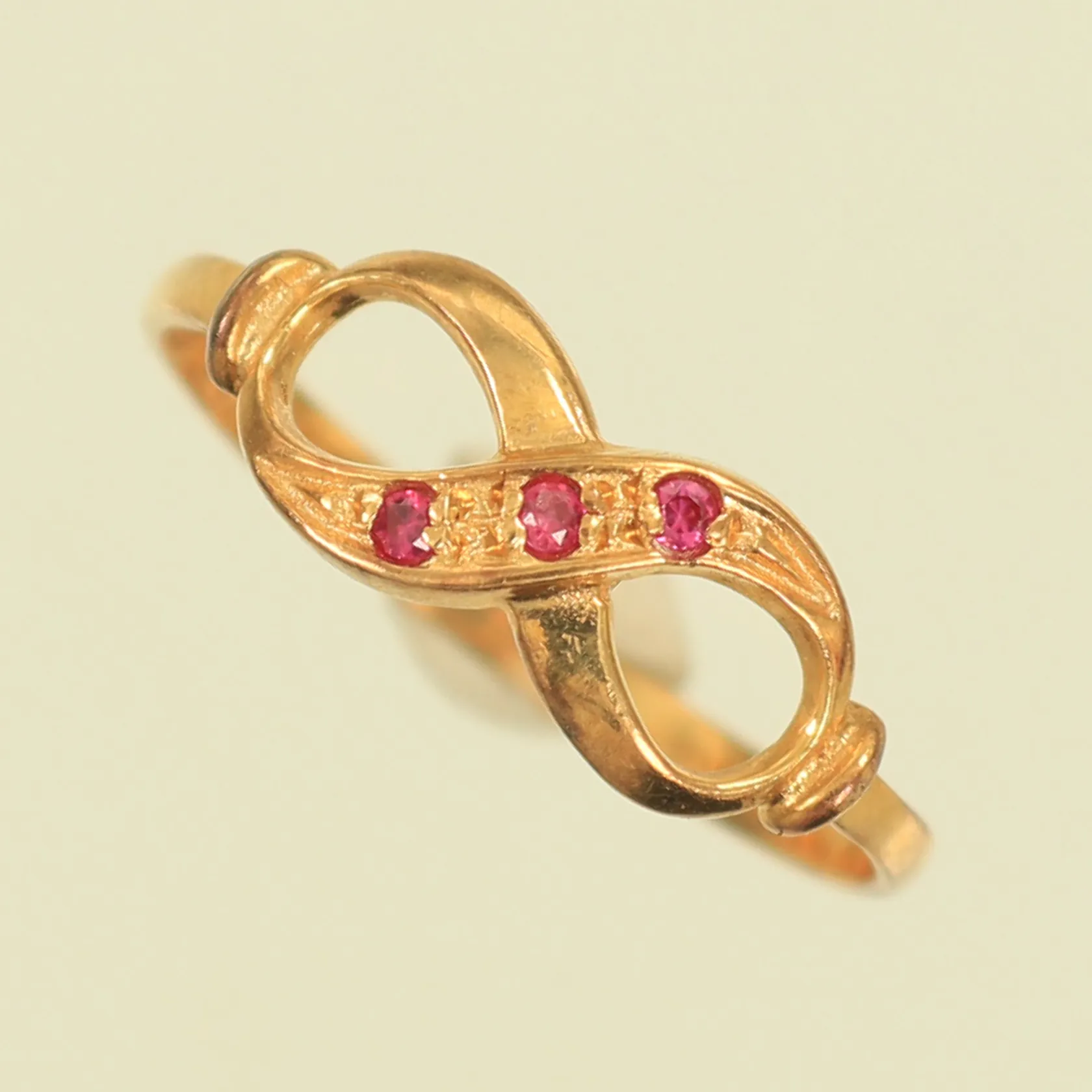 Ring med 3 röda stenar och infinitysymbol, stl 15¾ bredd 2-6mm, 18K 1,1g totalt Vikt: 1,1 g.