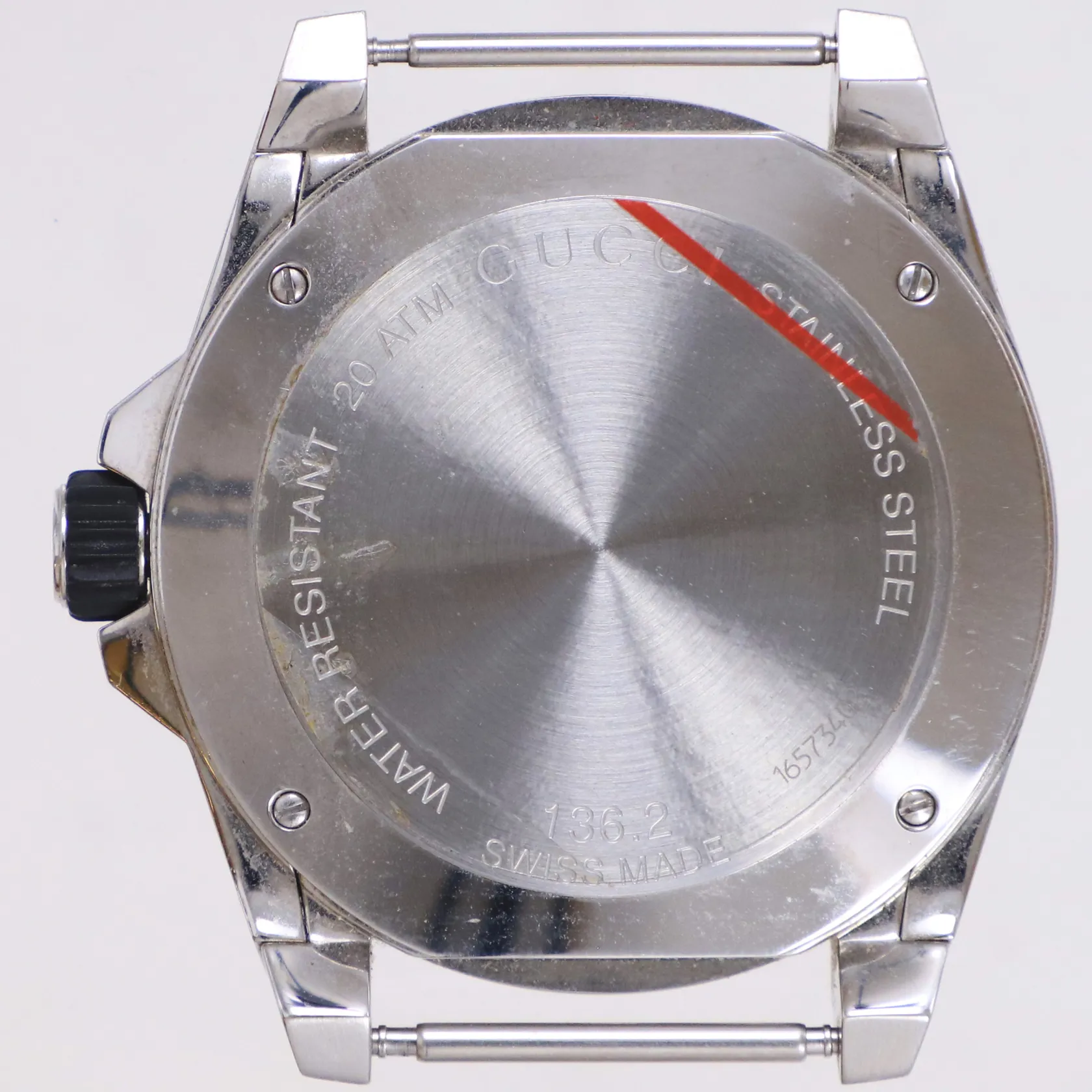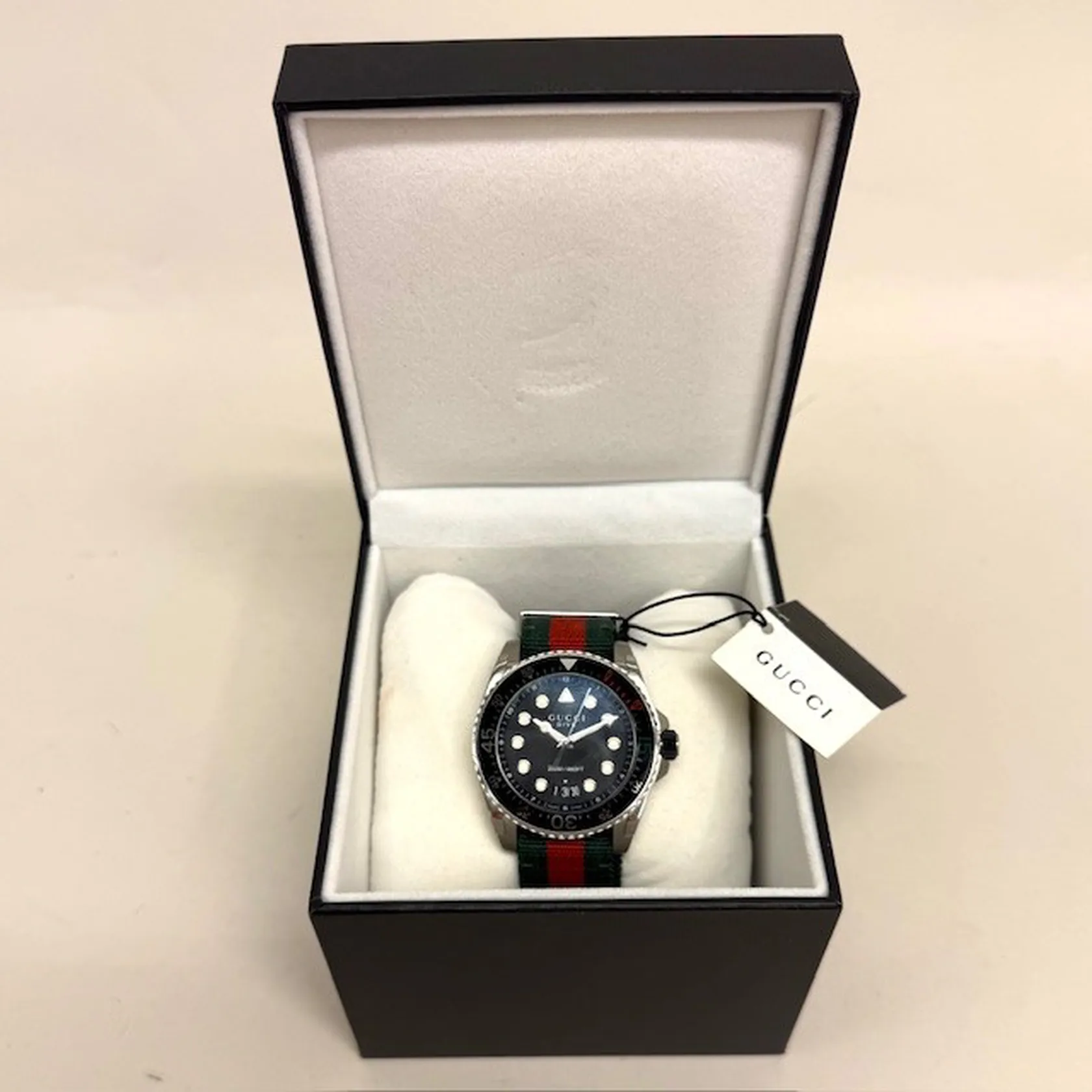 Herrur Gucci Dive stål quartz 45mm, referensnummer: 136.2, serienummer: 16573402, datum, safirglas, tygband med viklås, manual, originalbox