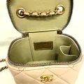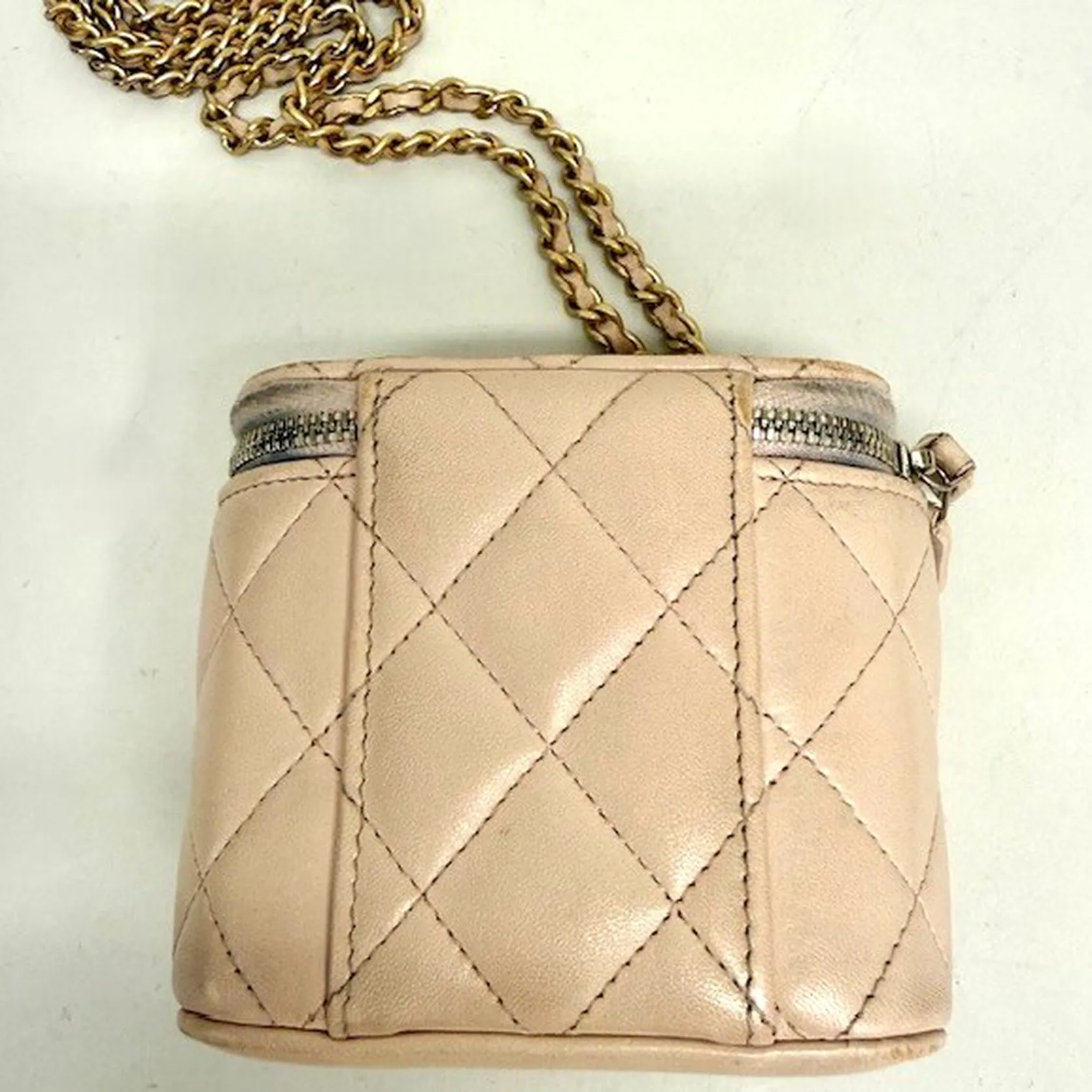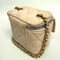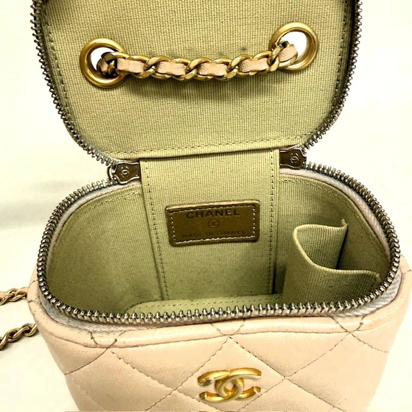 Väska Chanel Mini Vanity Bag, beige/puderrosa quiltat skinn med detaljer i gulmetall, mått ca 10x9x7cm, snr 31814009, färgbortfall på Chanel-logga samt kedja, nött i hörn, fläckar, märken, certifikat, kvitto från Chanel Birger Jarlsgatan 2022, inköpt på Affordable Luxury 2024, dustbag (släppt i söm), ytterkartong