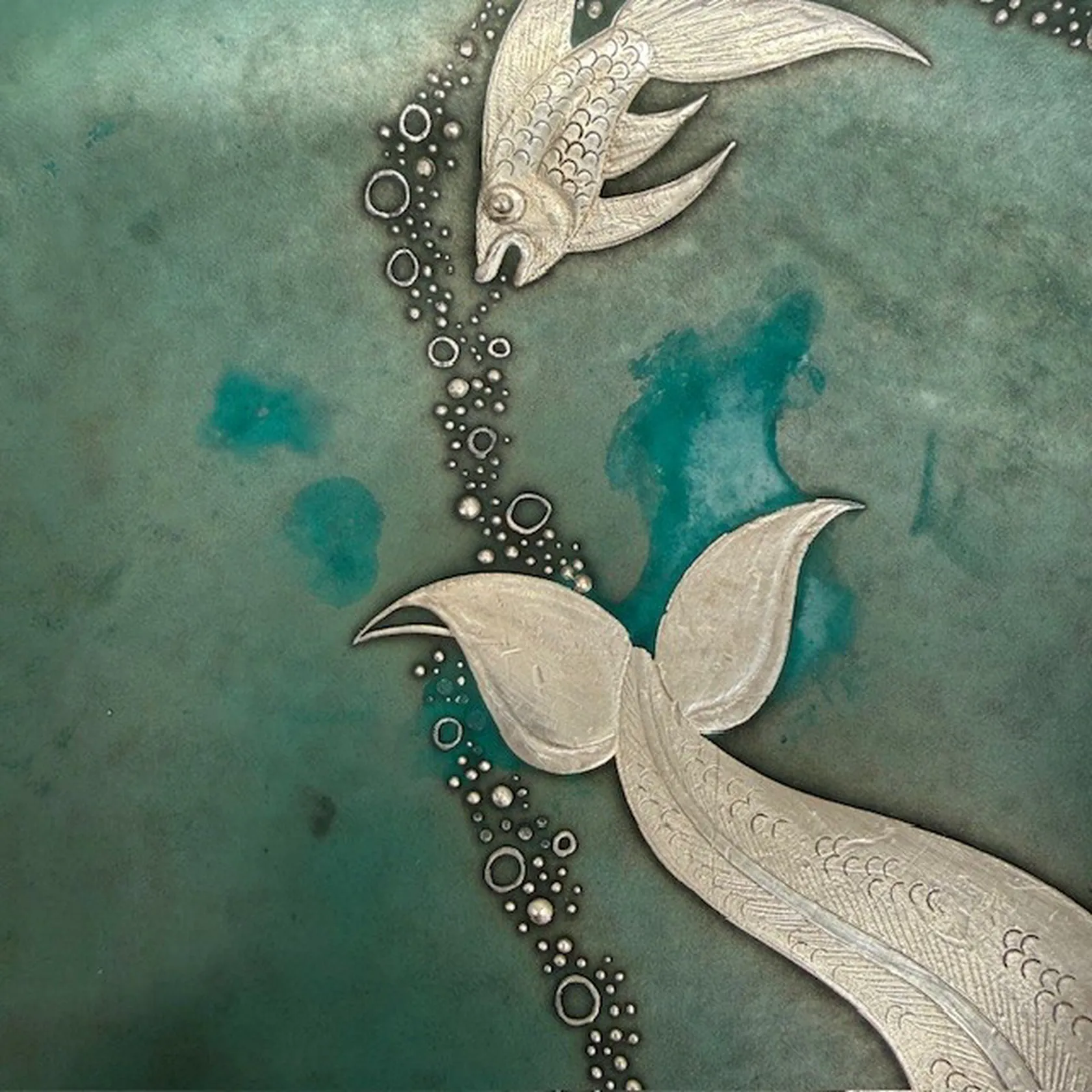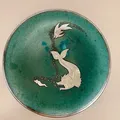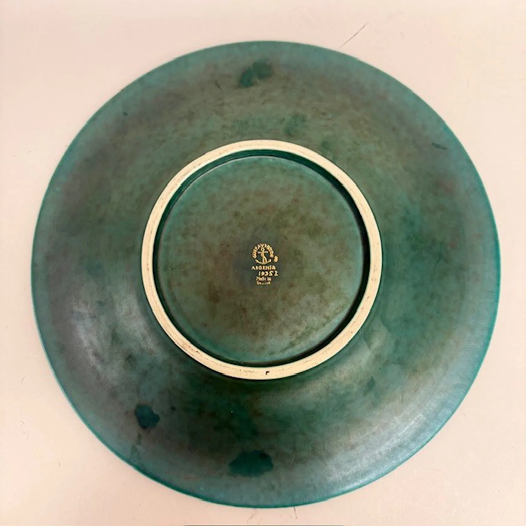 Fat Argenta 1035 med fiskdekor, Wilhelm Kåge för Gustavsberg, Ø30cm, grönglaserat stengods med silverdekor, glasyrfläckar, repor Skickas med postpaket.