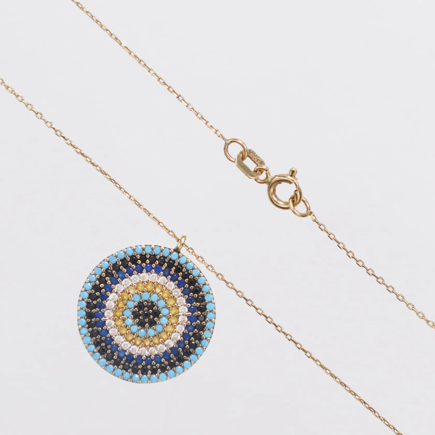 Collier med hänge färgade stenar längd 42,5cm bredd 0,5mm hängdel Ø18mm 14K Vikt: 2,7 g.