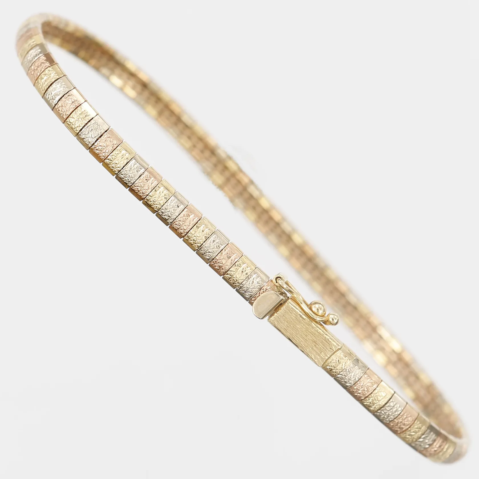 Armband, halvstelt, längd: 18,5cm, bredd: 4mm, trefärgad, 18K guld. Vikt: 11,8 g.
