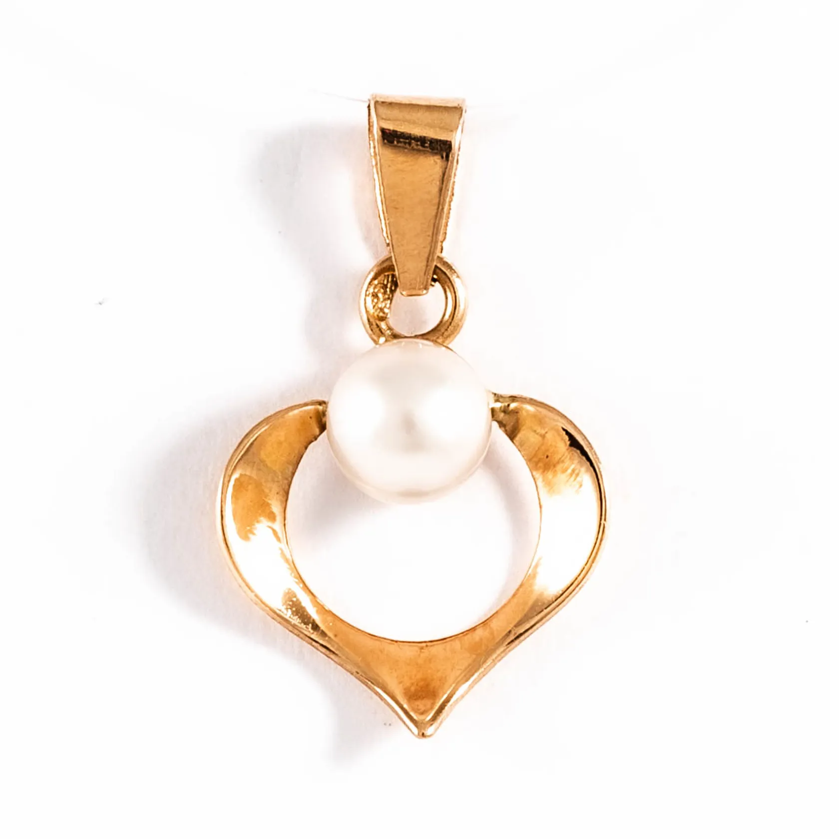 Hänge Hjärta i 18K guld med en odlad vit pärla Ø 4,5 mm. Det är 10 mm brett, 16,5 mm långt inkl ögla och väger 0,4g. Vikt: 0,4 g.