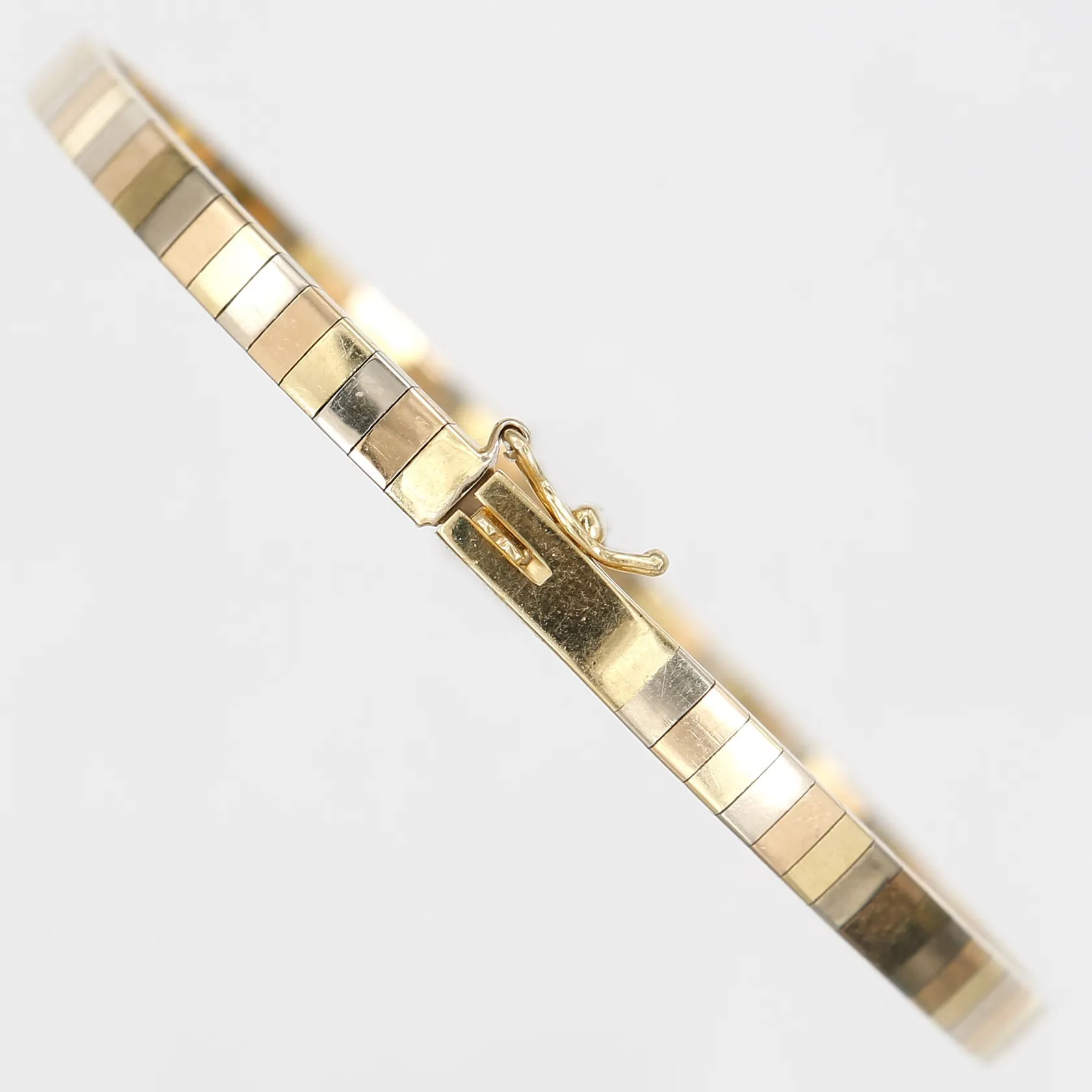 Armband, halvstelt, längd: 18,5cm, bredd: 4mm, trefärgat, bruksskick, 18K guld. Vikt: 12,7 g.