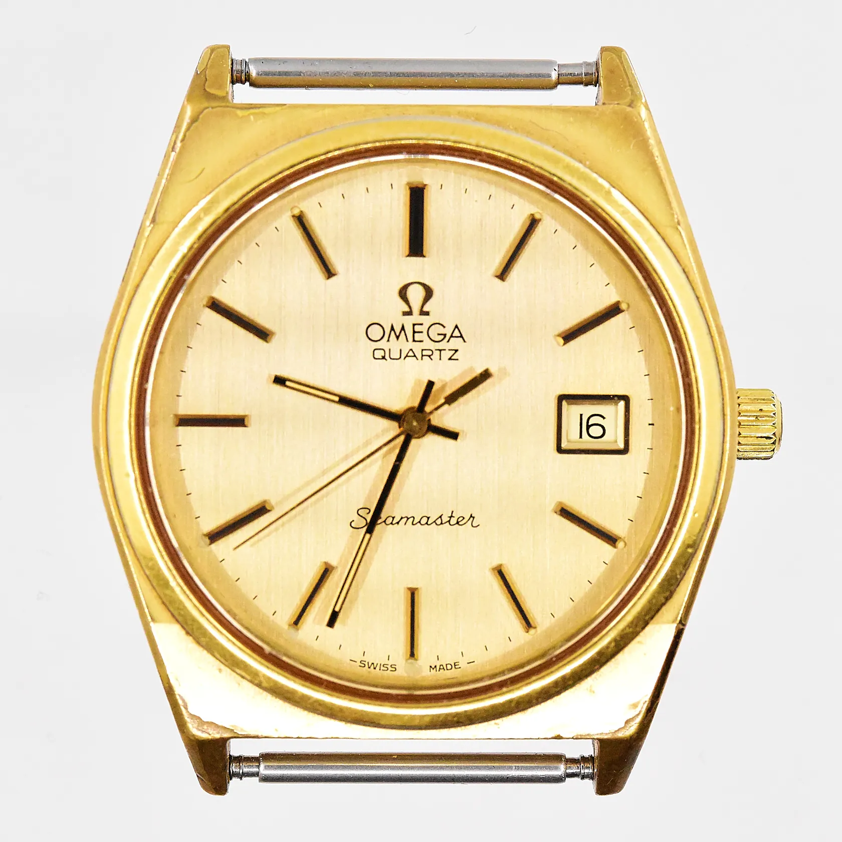 Herrur Omega Seamaster Ø 35mm guld/stål, quartz defekt krona fungerar ej att ställa visare graverad boett, band saknas