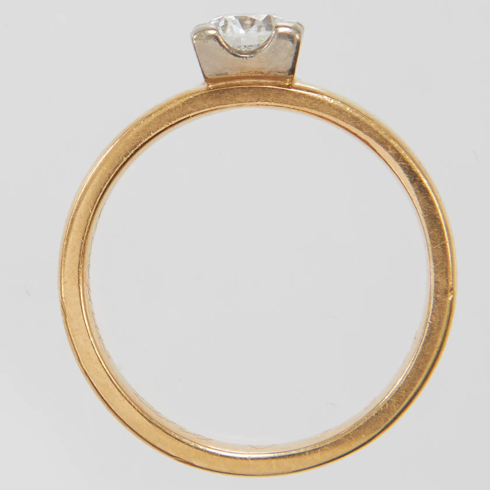 Ring med briljantslipad diamant 1 x ca 0,44ct, ca.TW/SI2, stl 16¾, bredd 3,5mm, höjd 5mm, svenska stämplar, gravyr, 18K Vikt: 4,9 g.