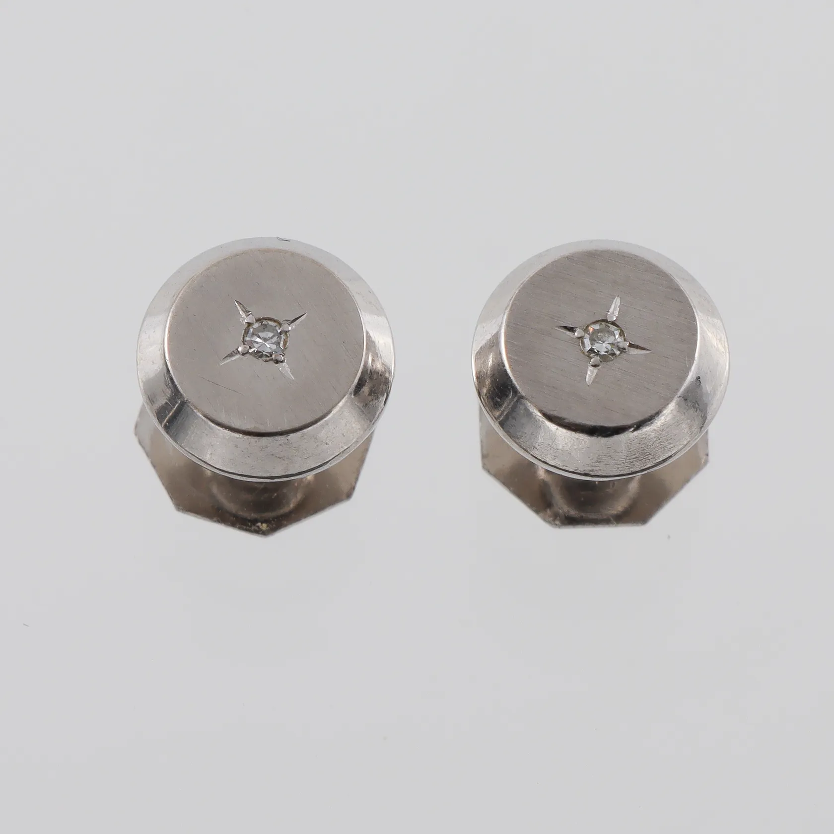Skjortknappar paret 18k vitguld med diamanter på 2x0.015 ct enligt inskription,Alton Guldvaru AB 1968,diameter 9 mm. Vikt: 2,7 g.