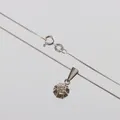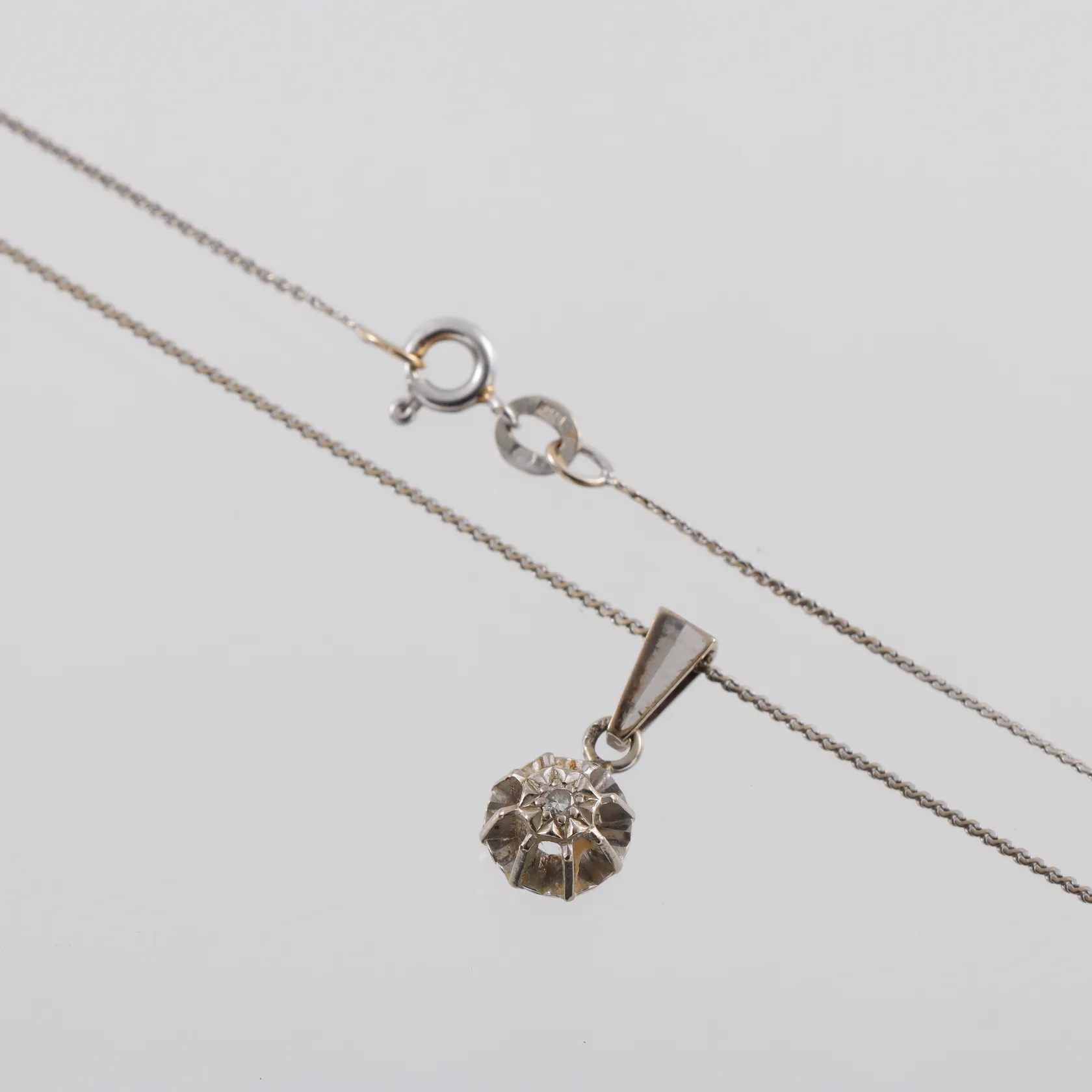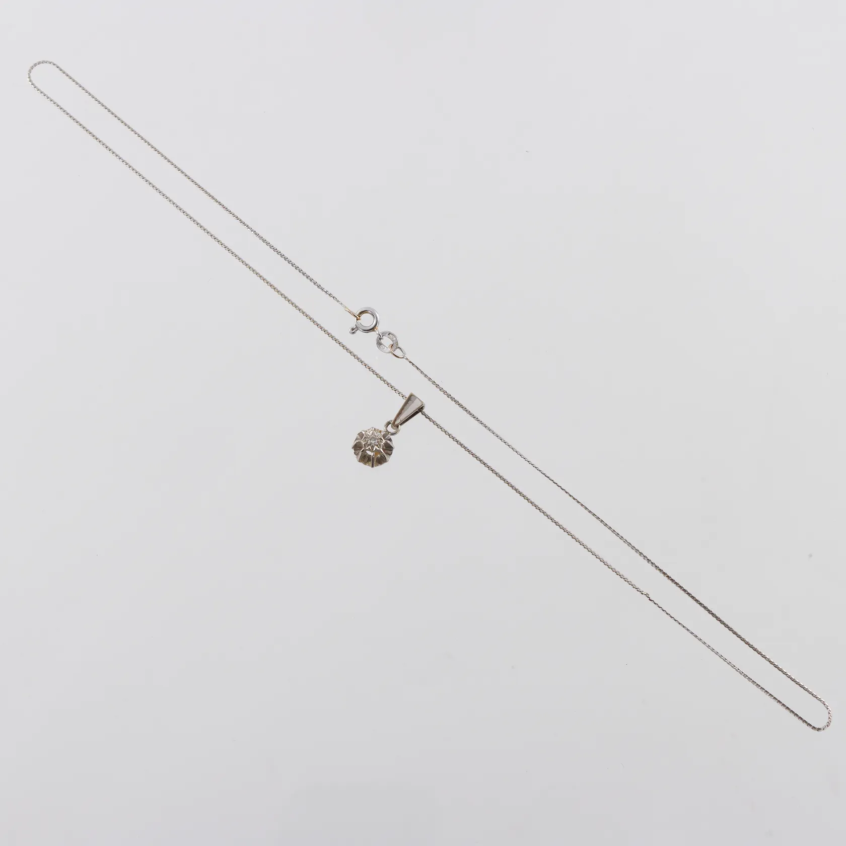 Diamantsmycke 18k vitguld med diamant på ca 0.015 ct,längd ca 38 cm,hängets höjd med ögla ca 17 mm. Vikt: 2,6 g.