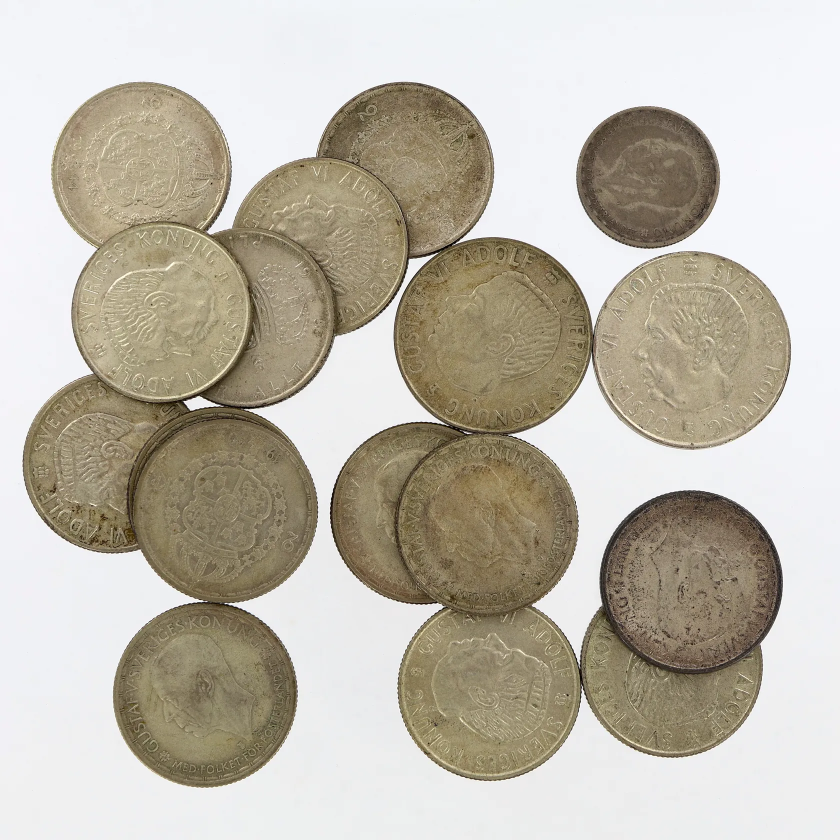 17 silvermynt i olika valörer och årtal, silver 400/1000 Vikt: 238,3 g.