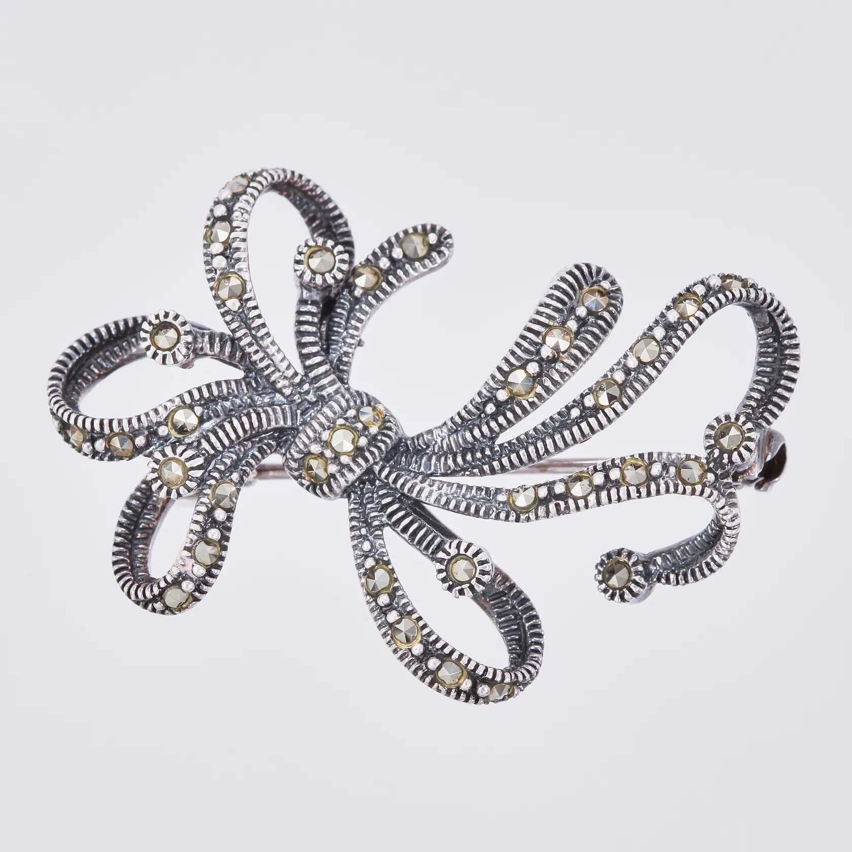 Brosch med markasiter längd ca 35mm, bredd ca 22mm, 925/1000 silver Vikt: 4,8 g.