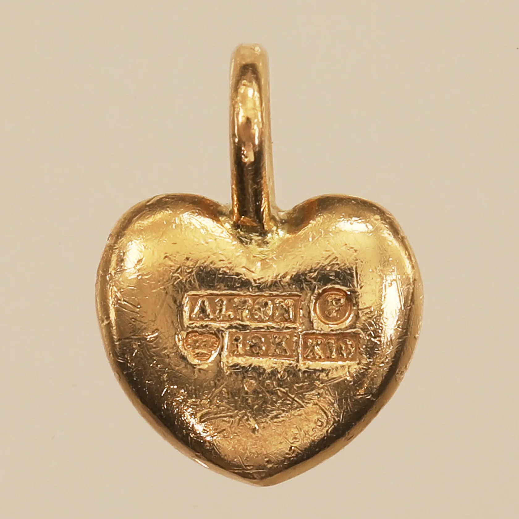 Hänge hjärta, längd 13,9mm inklusive ögla, bredd 10,2mm, Alton Falköping 1996, repor, 18K Vikt: 2,6 g.