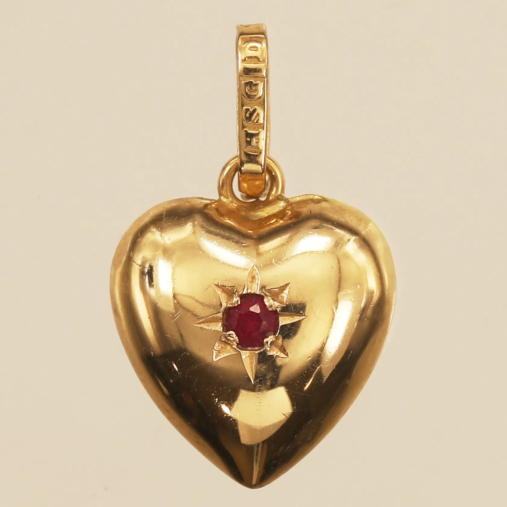 Hänge hjärta med röd sten, längd 18,5mm inklusive ögla, bredd 11mm, 18K Vikt: 0,8 g.