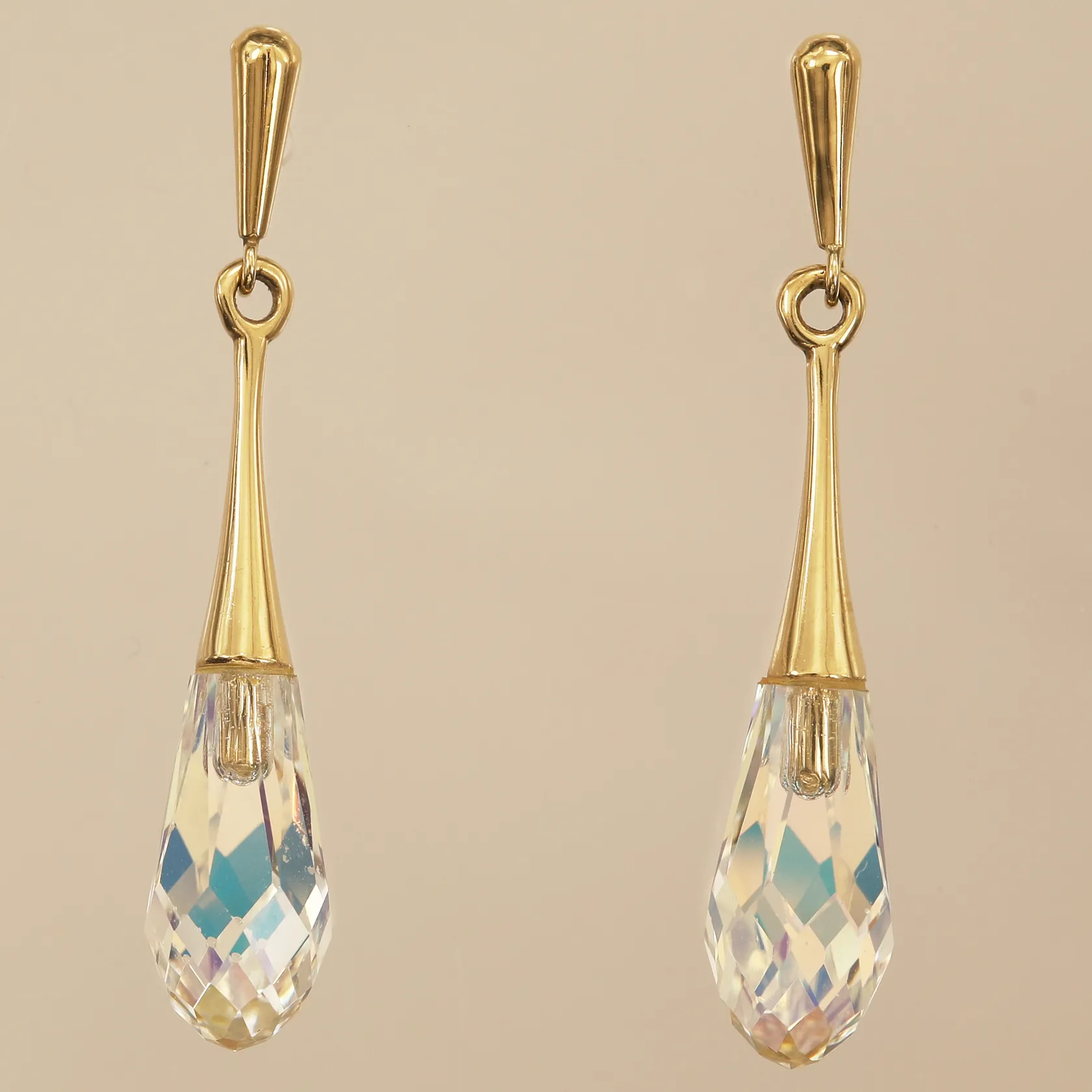 Ett par örhängen med plastprismor, längd ca 32mm, bredd 6mm, 18K Vikt: 2,5 g.