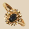 Carmoséring med diamanter 10x ca 0,001ct, blå sten troligen safir, stl 17¾, bredd 11,9mm, 18K Vikt: 3,4 g.