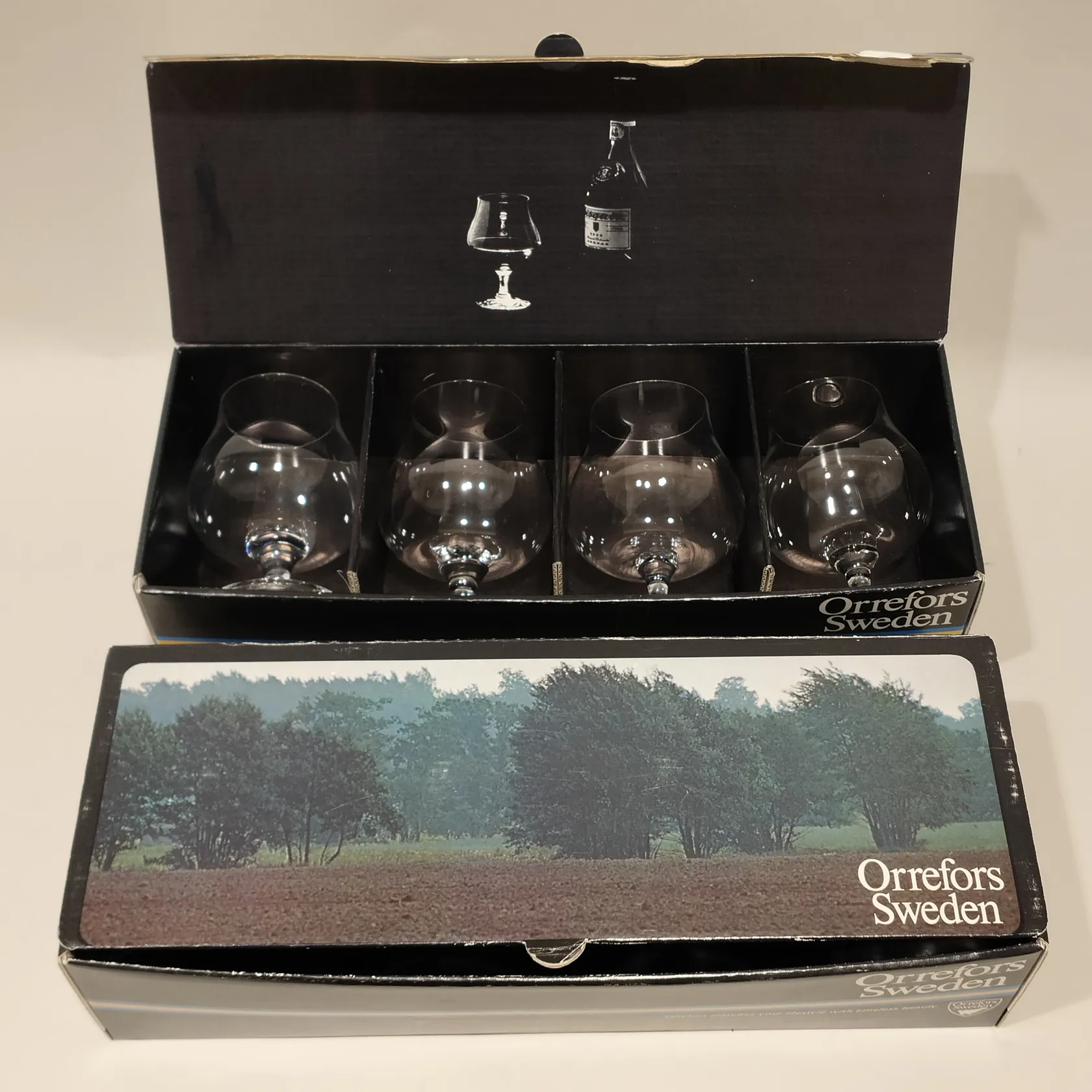 Åtta cognacskupor, Nils Landberg för Orrefors, höjd ca 11cm, originalkartonger Skickas med postpaket.