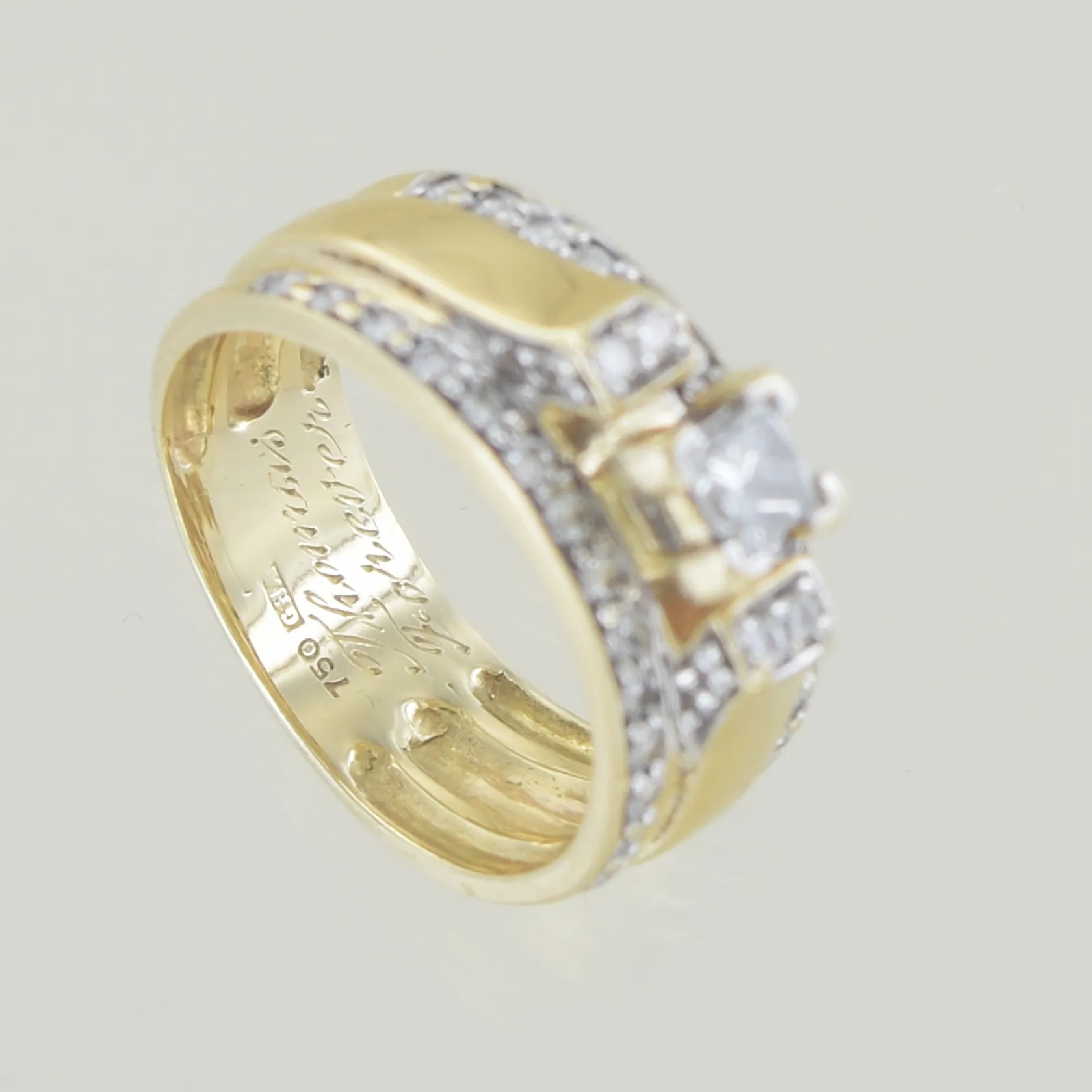 Ring med diamanter 0,10ct + 0,02ct x 32, Ø 15¾ mm, bredd 7 mm, graverad, 18K Vikt: 5,2 g.