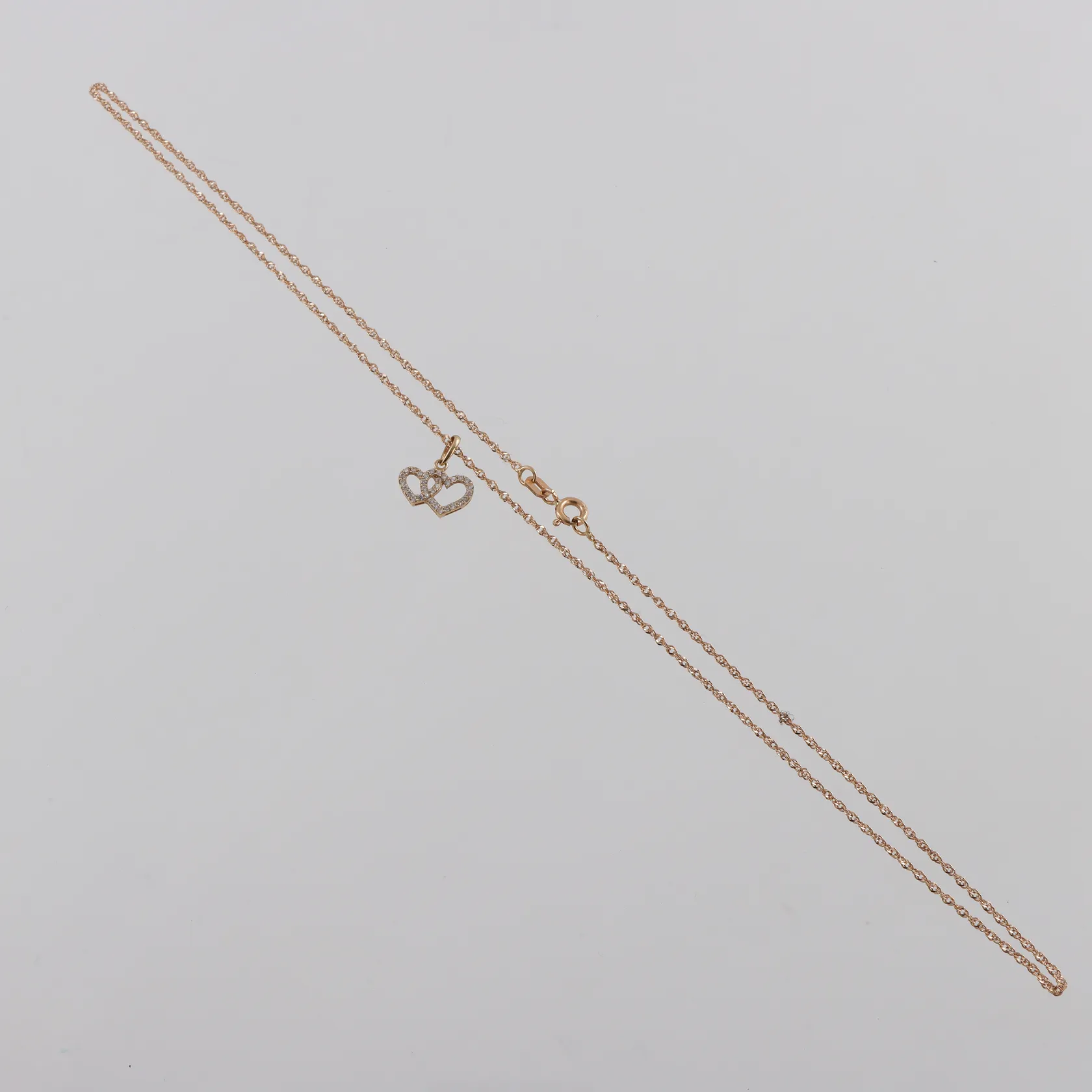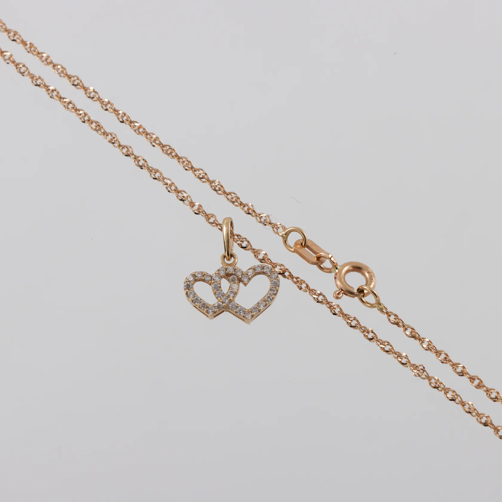 Collier Singapore med hänge dubbelhjärta och små stenar 18k, längd ca 40 cm,hängets höjd ca 7.8 mm. Vikt: 2,3 g.