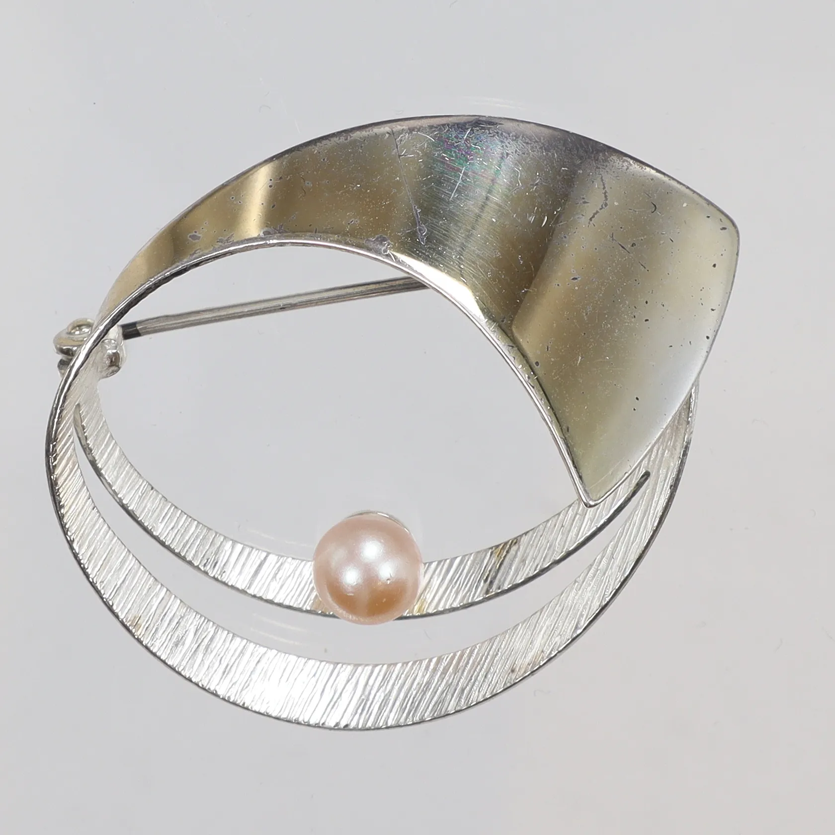 Brosch med imitationspärla mönstrad 37x32mm, med slitage silver 830/1000 Vikt: 5,1 g.