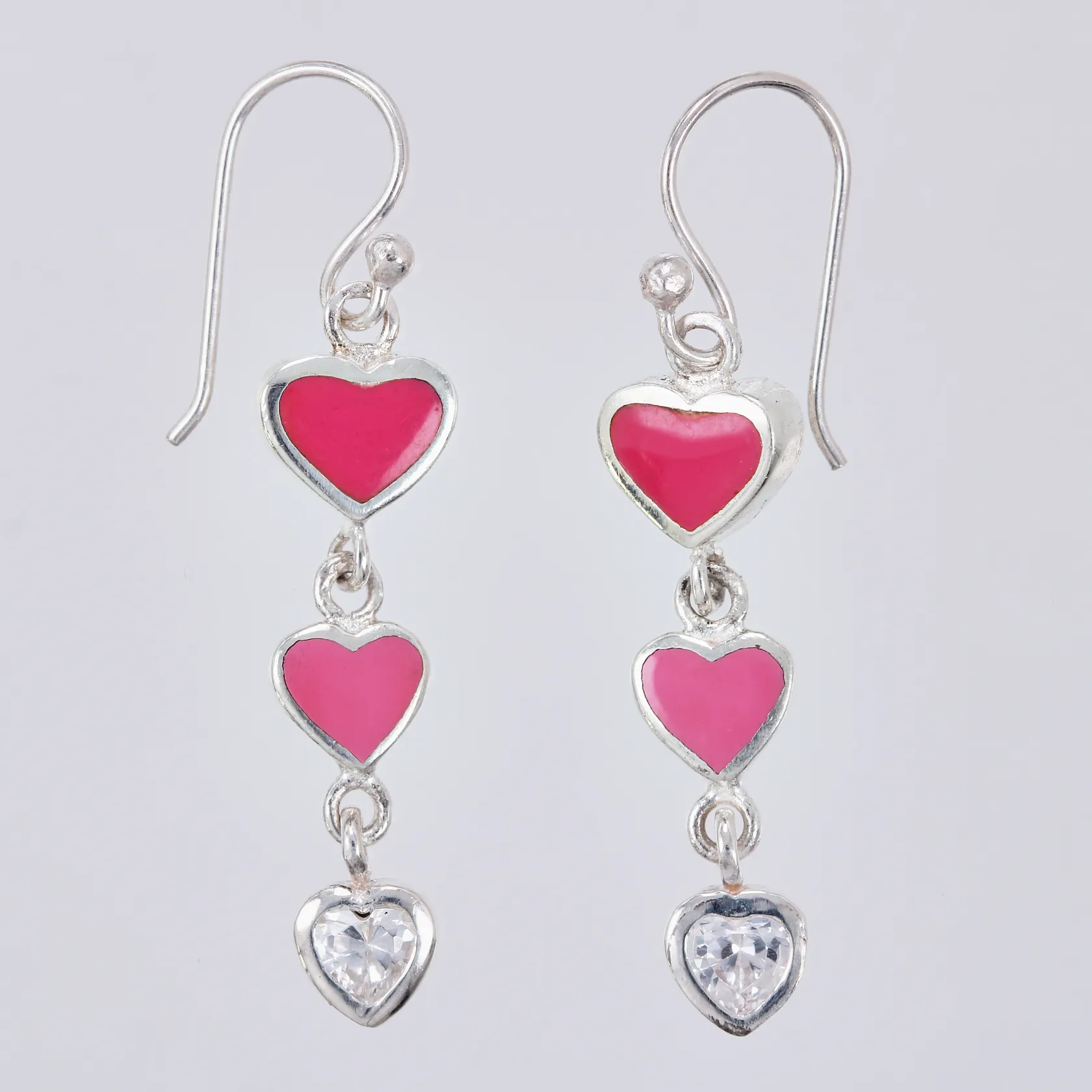 Ett par örhängen hjärtan med färgad emalj och vita stenar längd: ca 3,8cm bredd: ca 6-8mm GHA 925/1000 Vikt: 3,7 g.