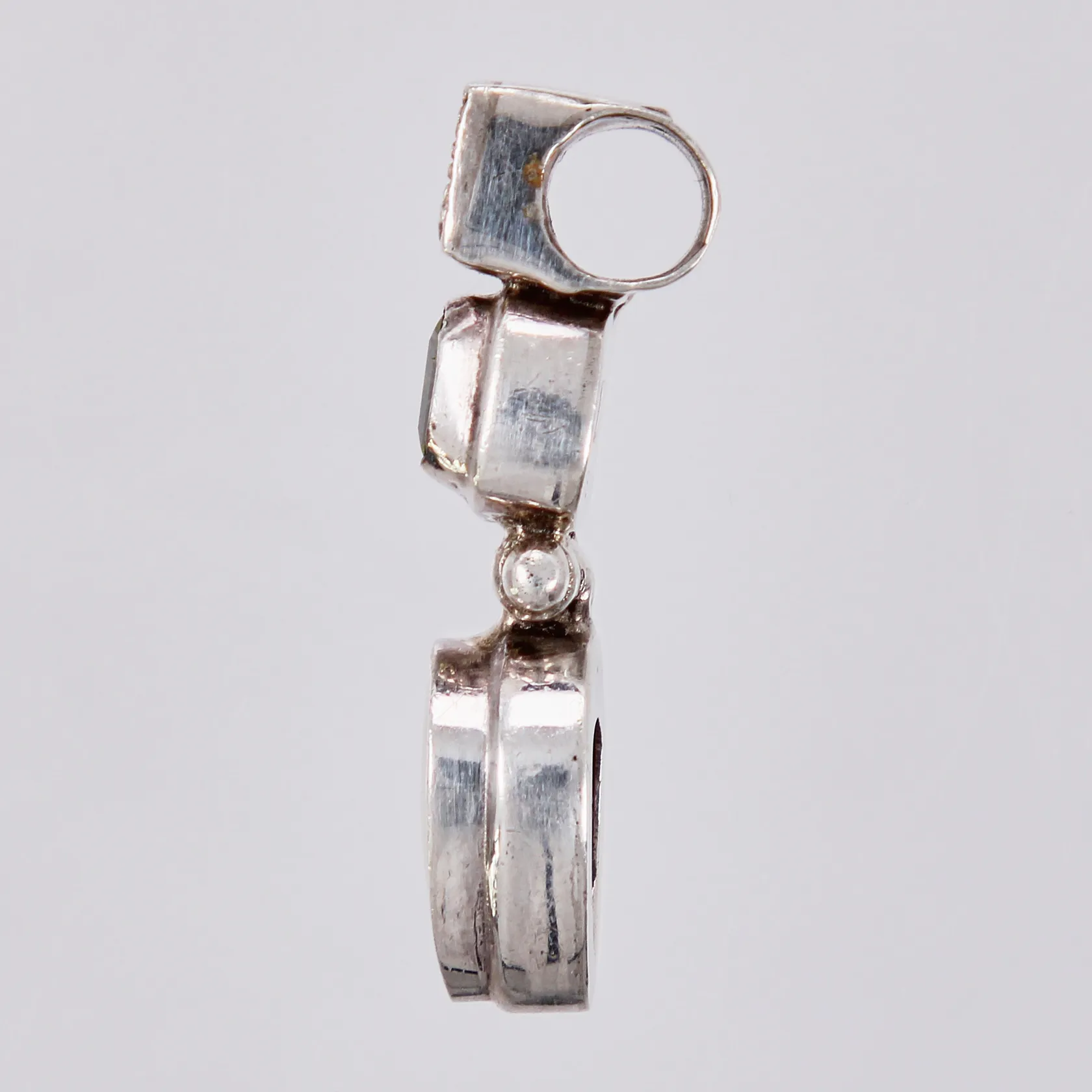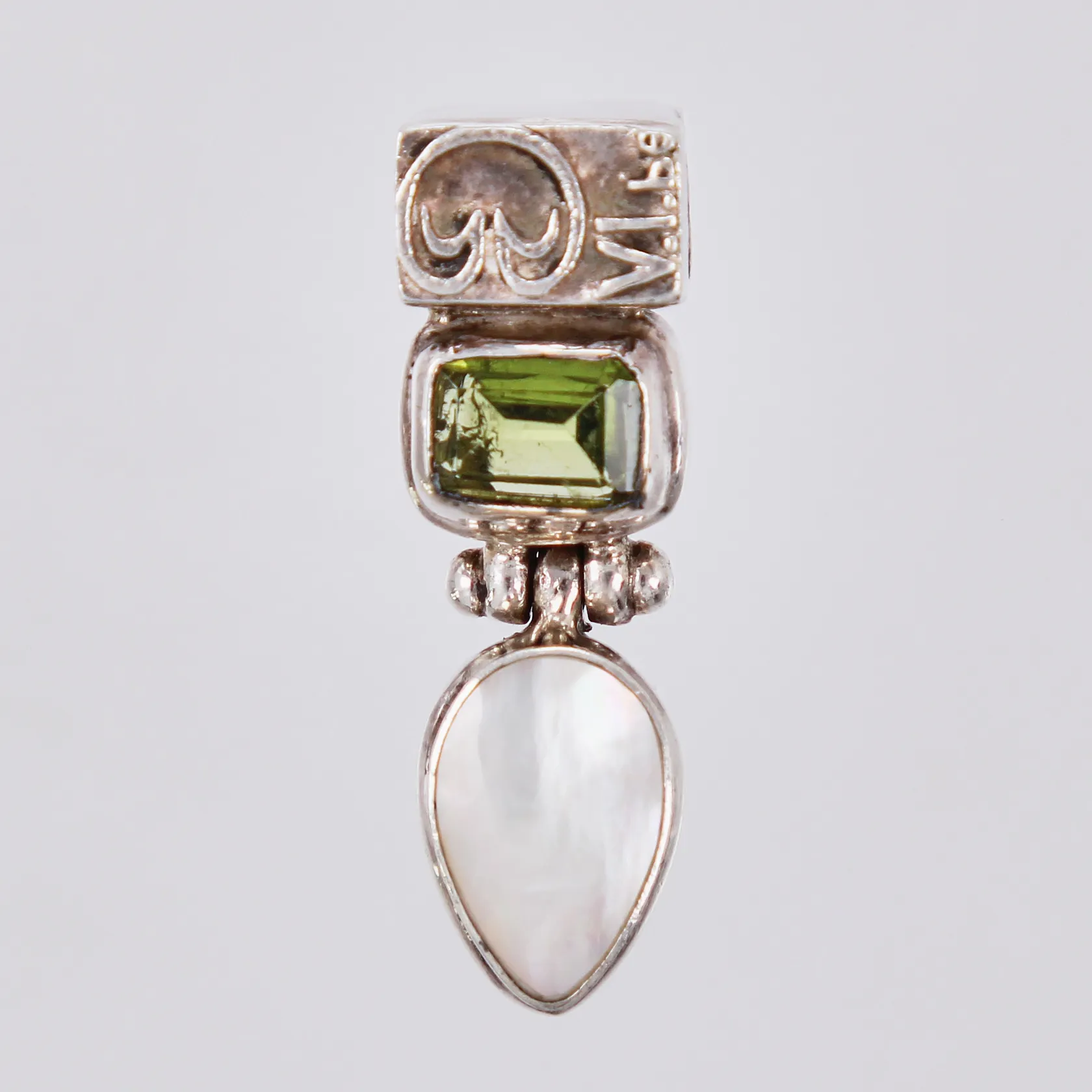 Hänge med pärlemor och peridot längd: ca 3cm bredd: ca 9-10mm 925/1000, silver Vikt: 6,3 g.