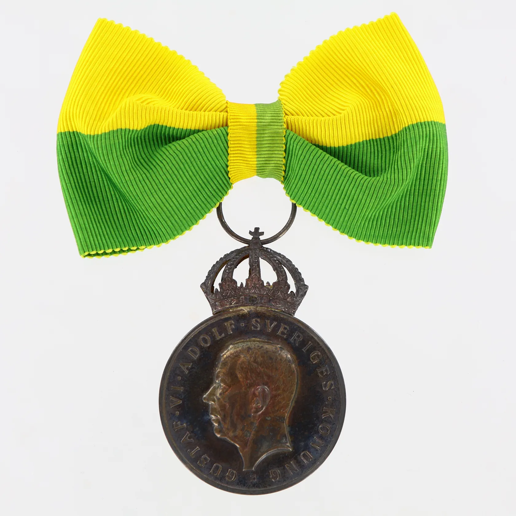 Silvermedalj/mynt, Ø31mm, längd inkl kronan ca 44mm, Gustaf VI Sveriges konung, 1967, gravyr, tygband, Vikt: 15,8 g.