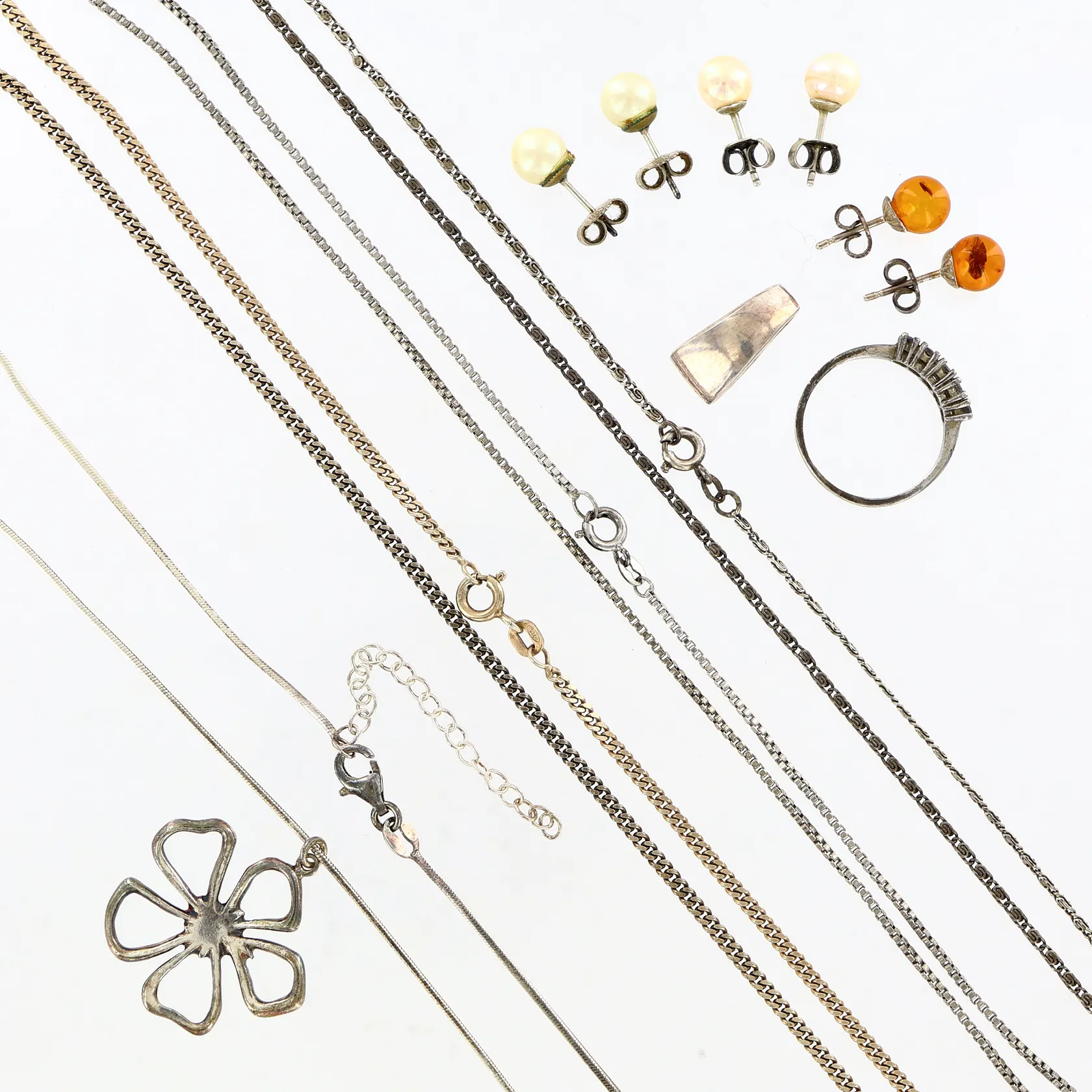 Tre kedjor samt en kedja med hänge, ett hänge, en ring, tre par örhängen, silver 830-925/1000 Vikt: 28,1 g.