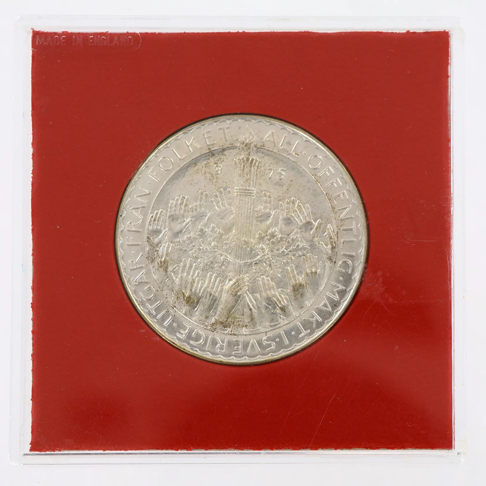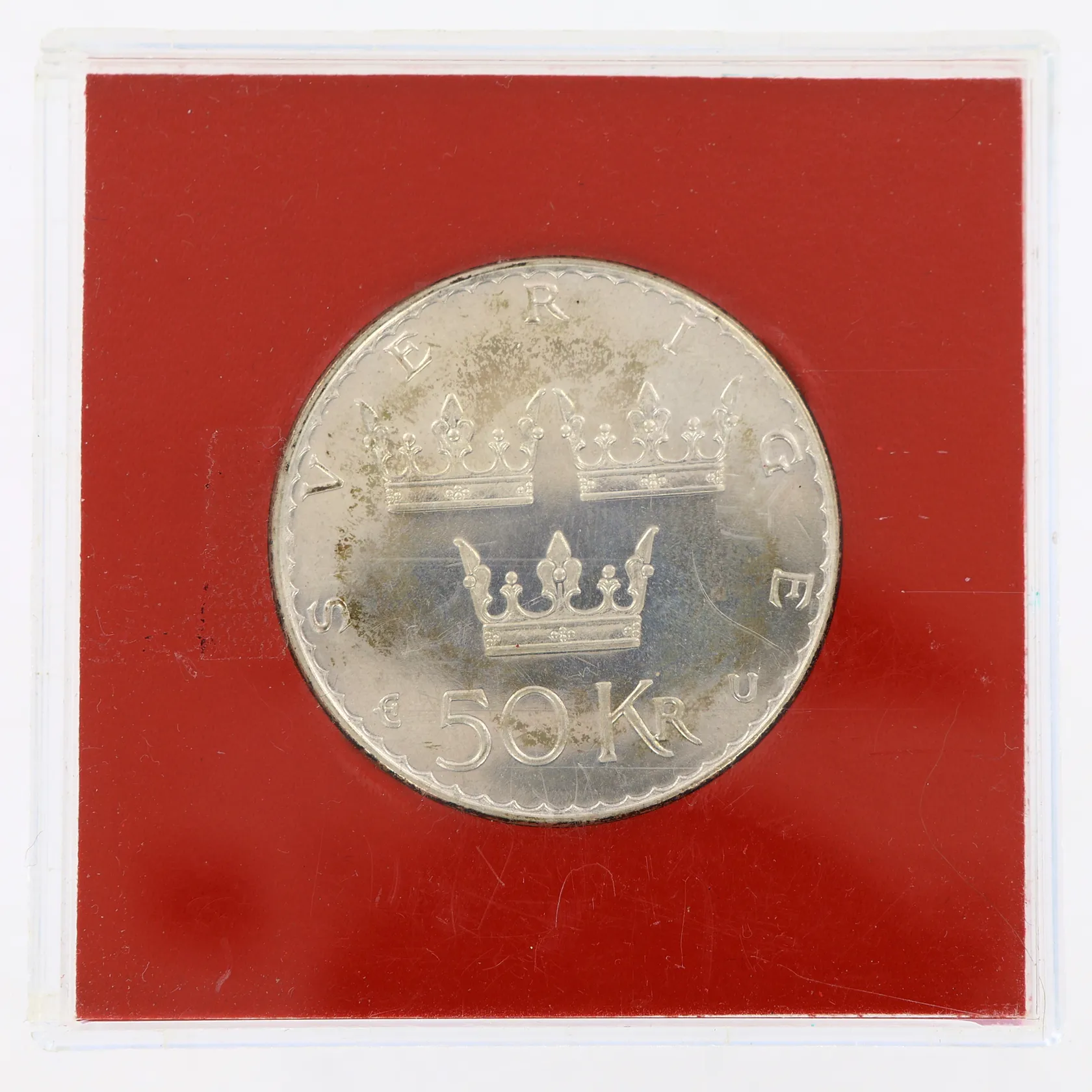 Minnesmynt med nominellt värde 50kr år 1975, plastetui, silver 925/1000 Vikt: 27 g.