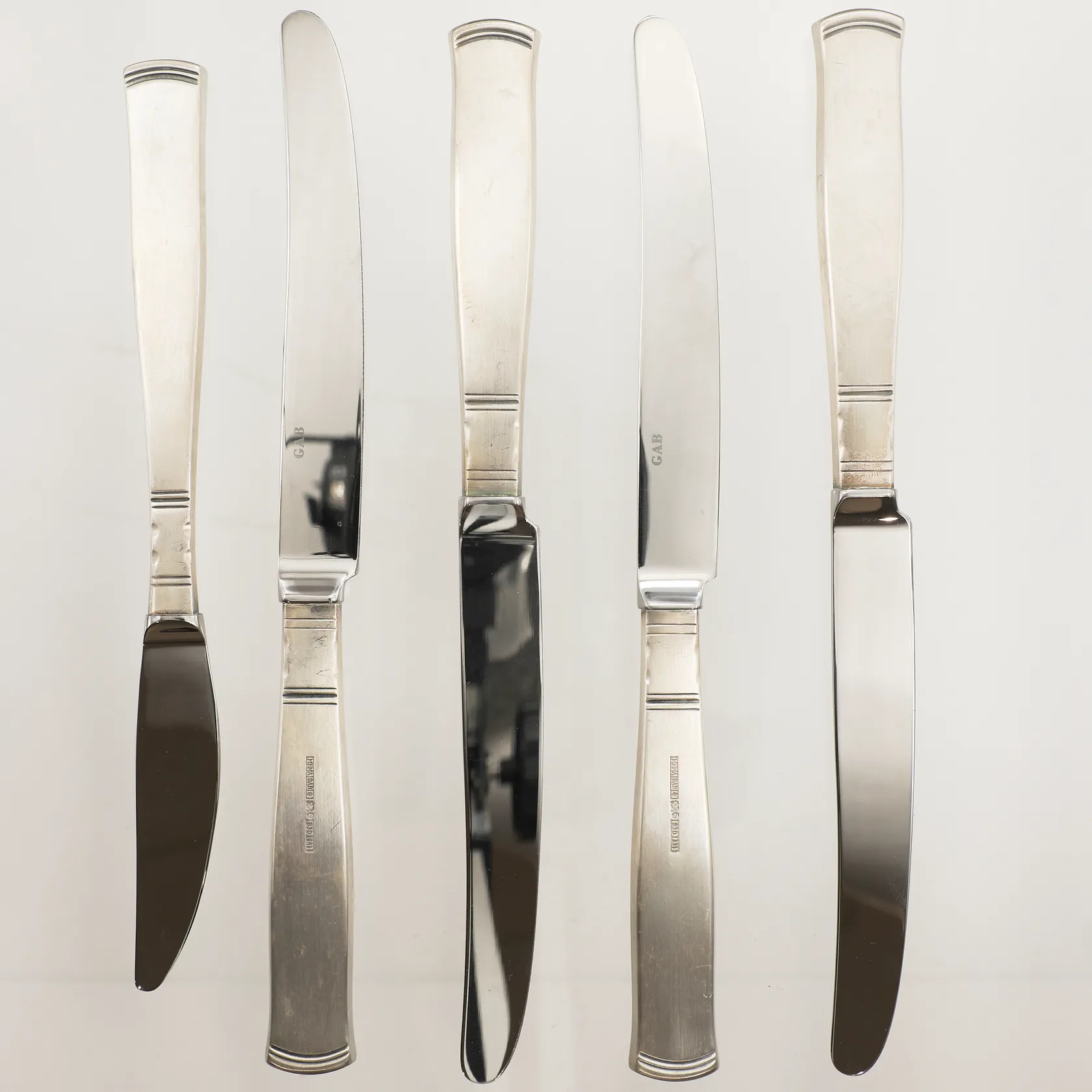 Fem knivar, modell: Rosenholm, ca 19-22,5cm, blad i stål, 830/1000 silver Vikt: 318,4 g.