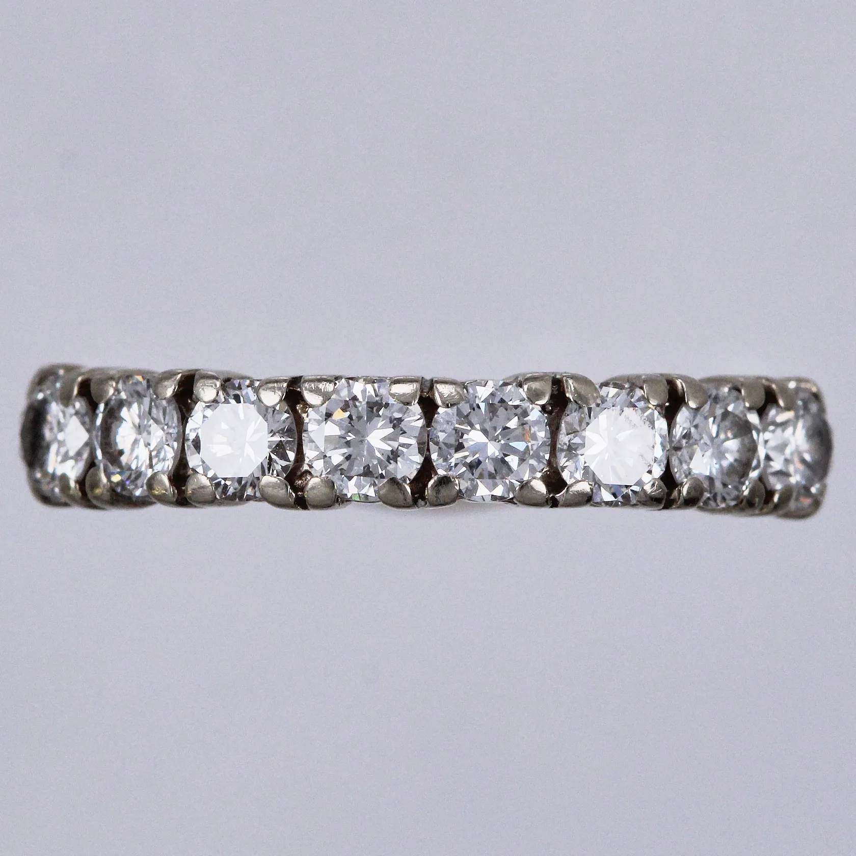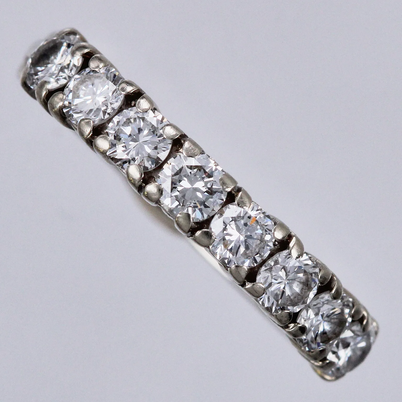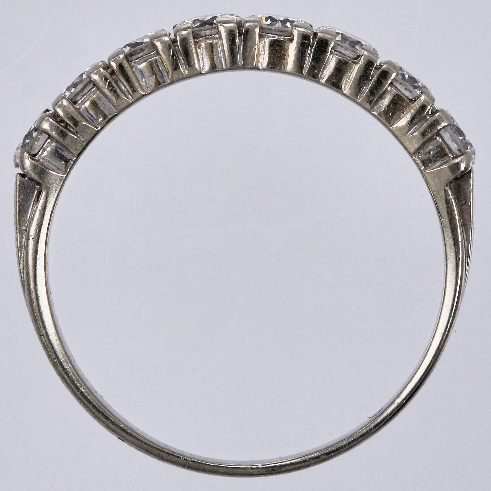 Ring med diamanter ca 8x0,10ct (varav 1 med nagg på rondist), ca W(H)/SI, stl: 17½, bredd ca 2-3mm, 18K Vikt: 2,8 g.