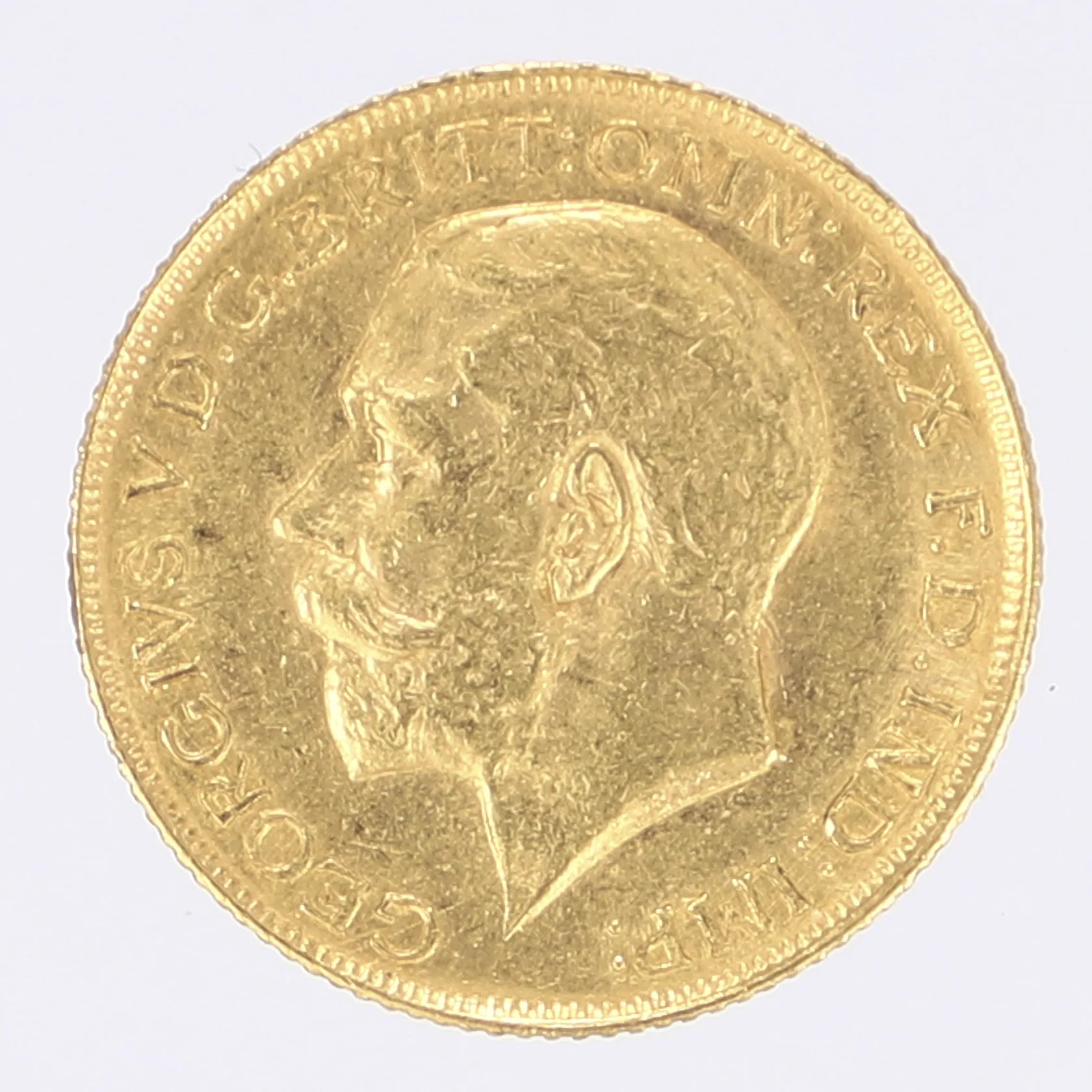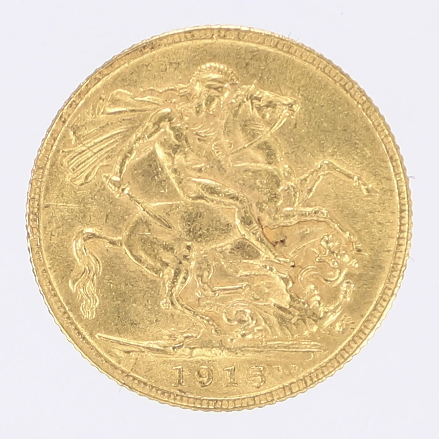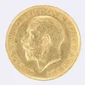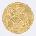 Mynt Sovereign år 1915, George V Storbritannien, Ø22mm, 21,6K Vikt: 8 g.