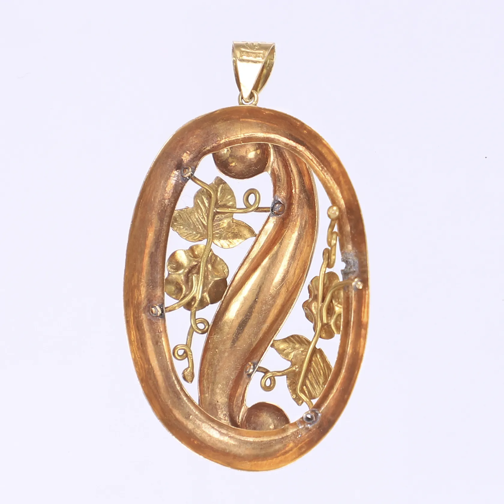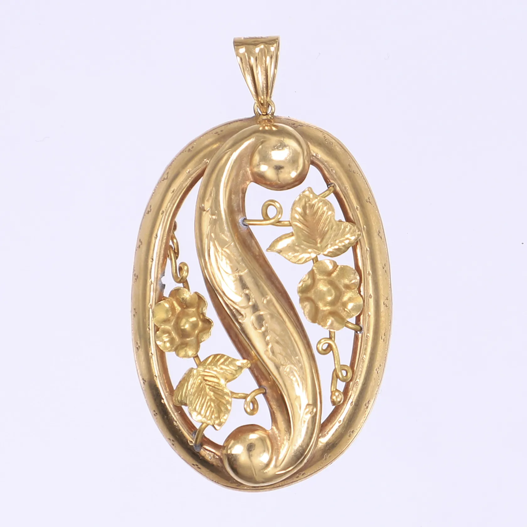 Hänge med genombruten floral dekor, 45x25mm inkl. ögla, tillv. Juvelfabriken Ab, Stockholm 1944, något bucklig, tennlödningar på baksida av smycke, 18K Vikt: 3,2 g.