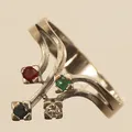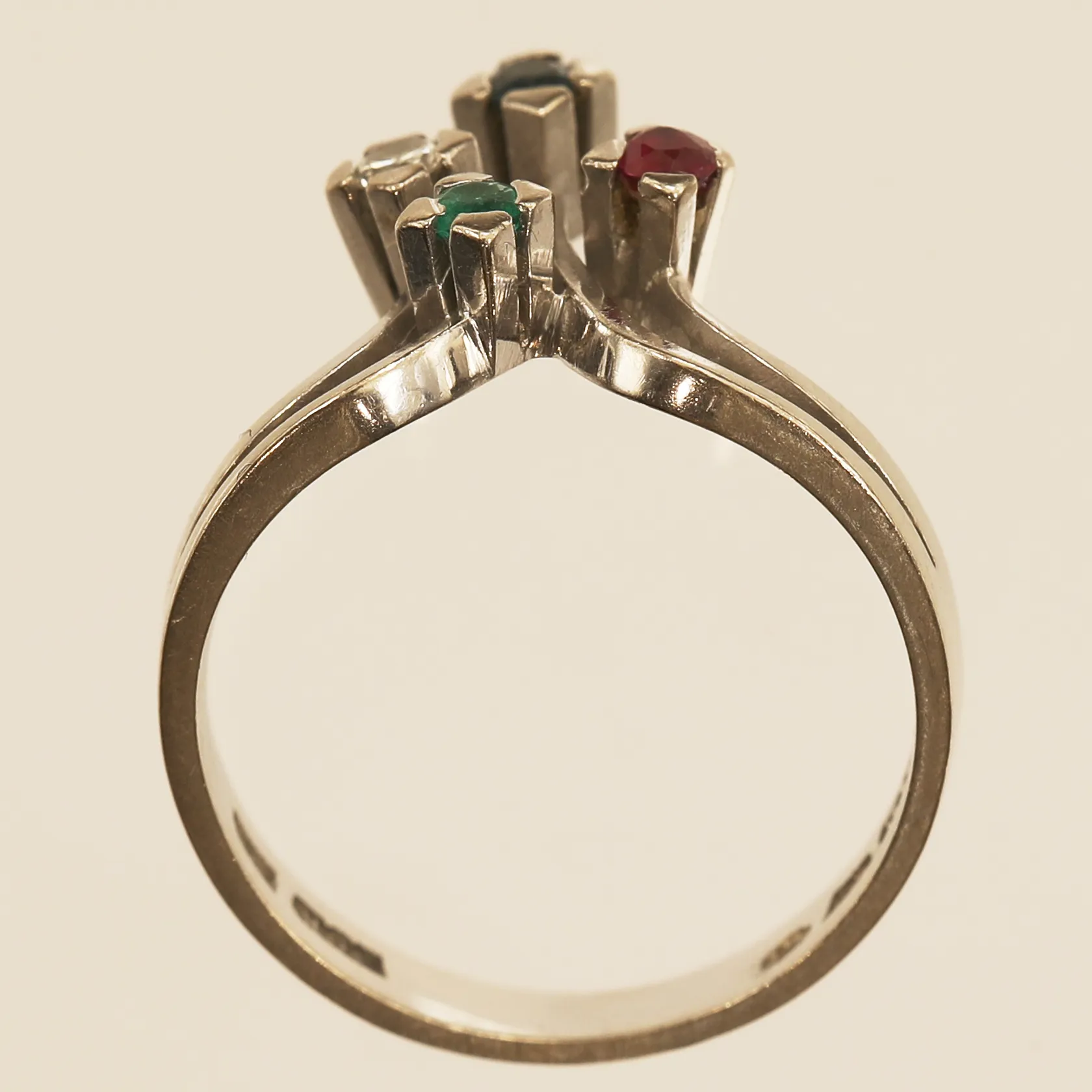 Ring med diamant ca 0,05ct, rubin, safir samt smaragd, troligen syntetiska, stl 17¼, bredd 14mm, Markströms Guldsmeds Ab K G, år 1974, vitguld, 18K Vikt: 4,6 g.
