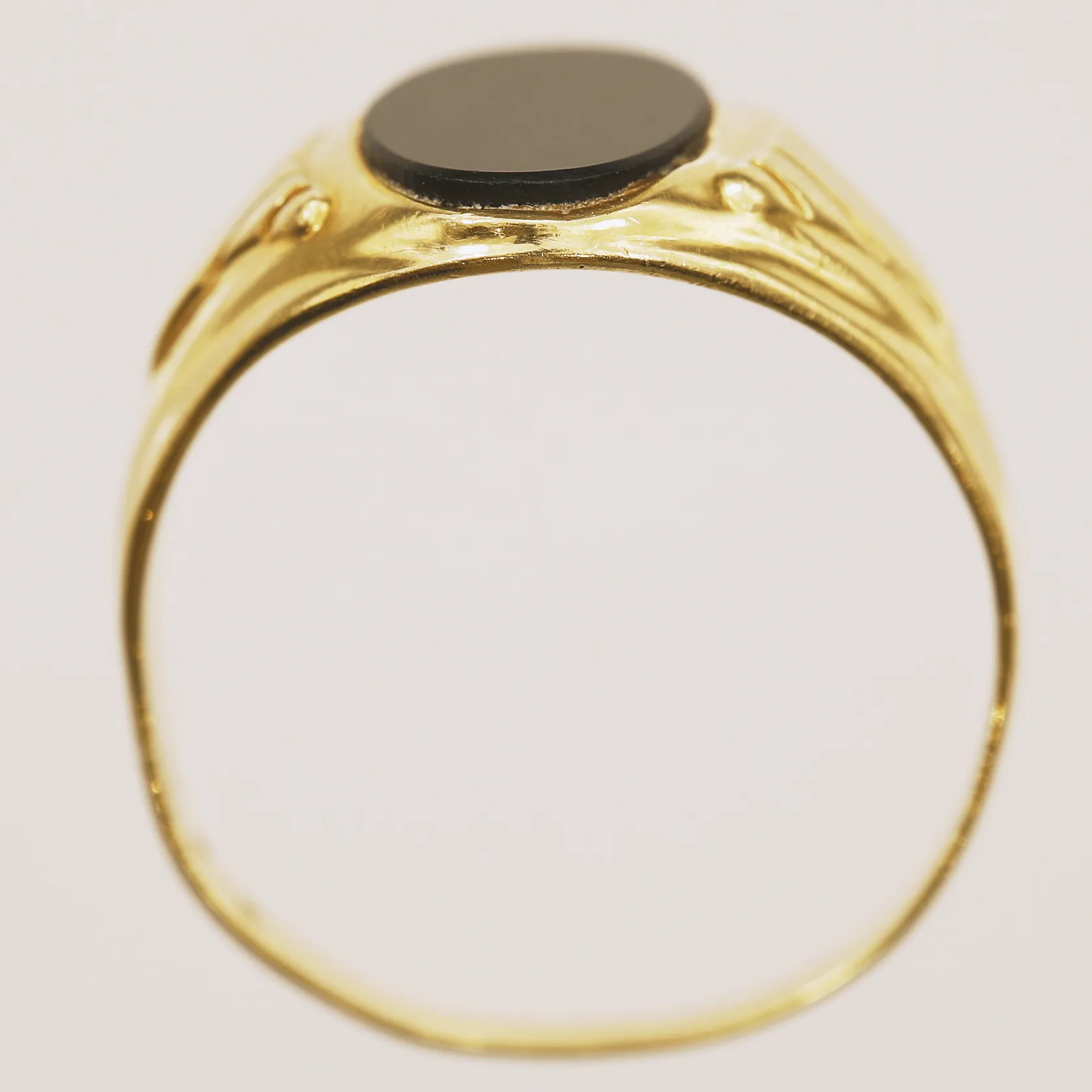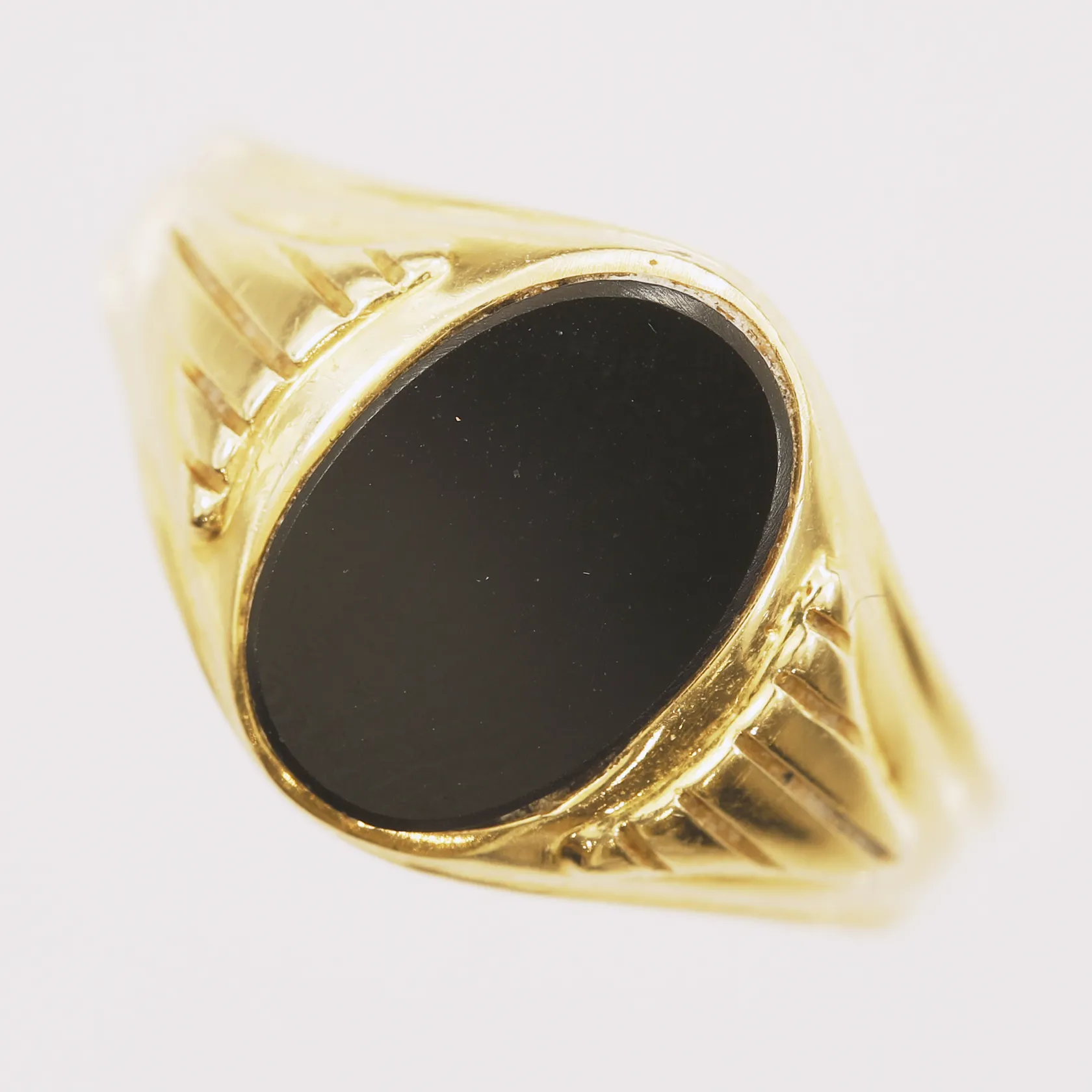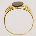Klackring med onyx, stl 19½, bredd 2-13,1mm, bucklig skena, 18K Vikt: 3,5 g.