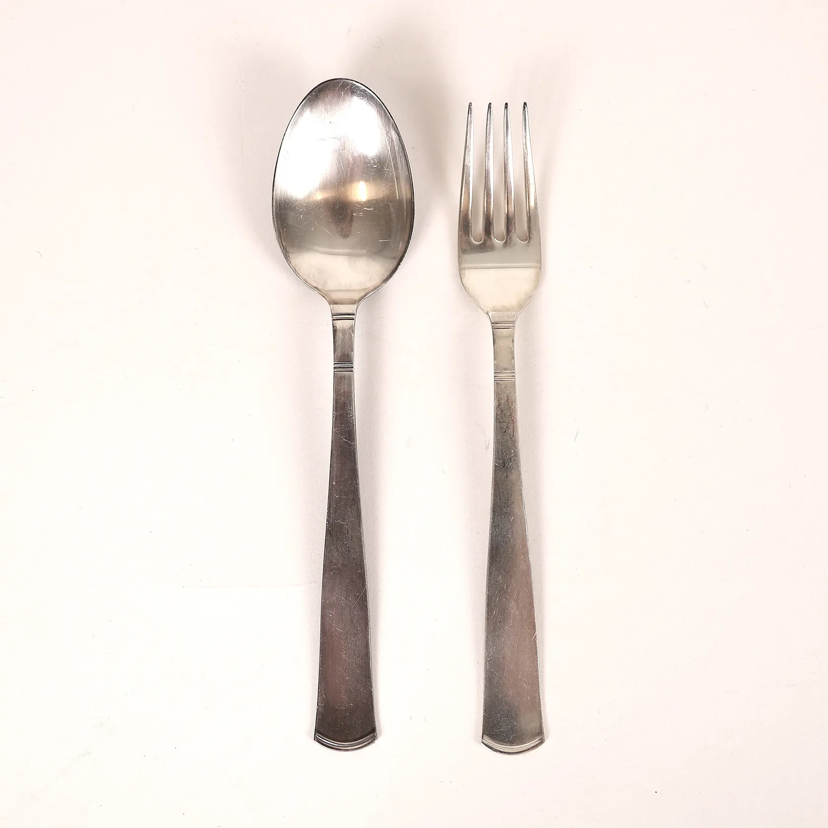 Gaffel och sked, modell Rosenholm, GAB, Stockholm, 1961, längd 17,5 respektive 18cm, bruksslitage, silver. Vikt: 81 g.