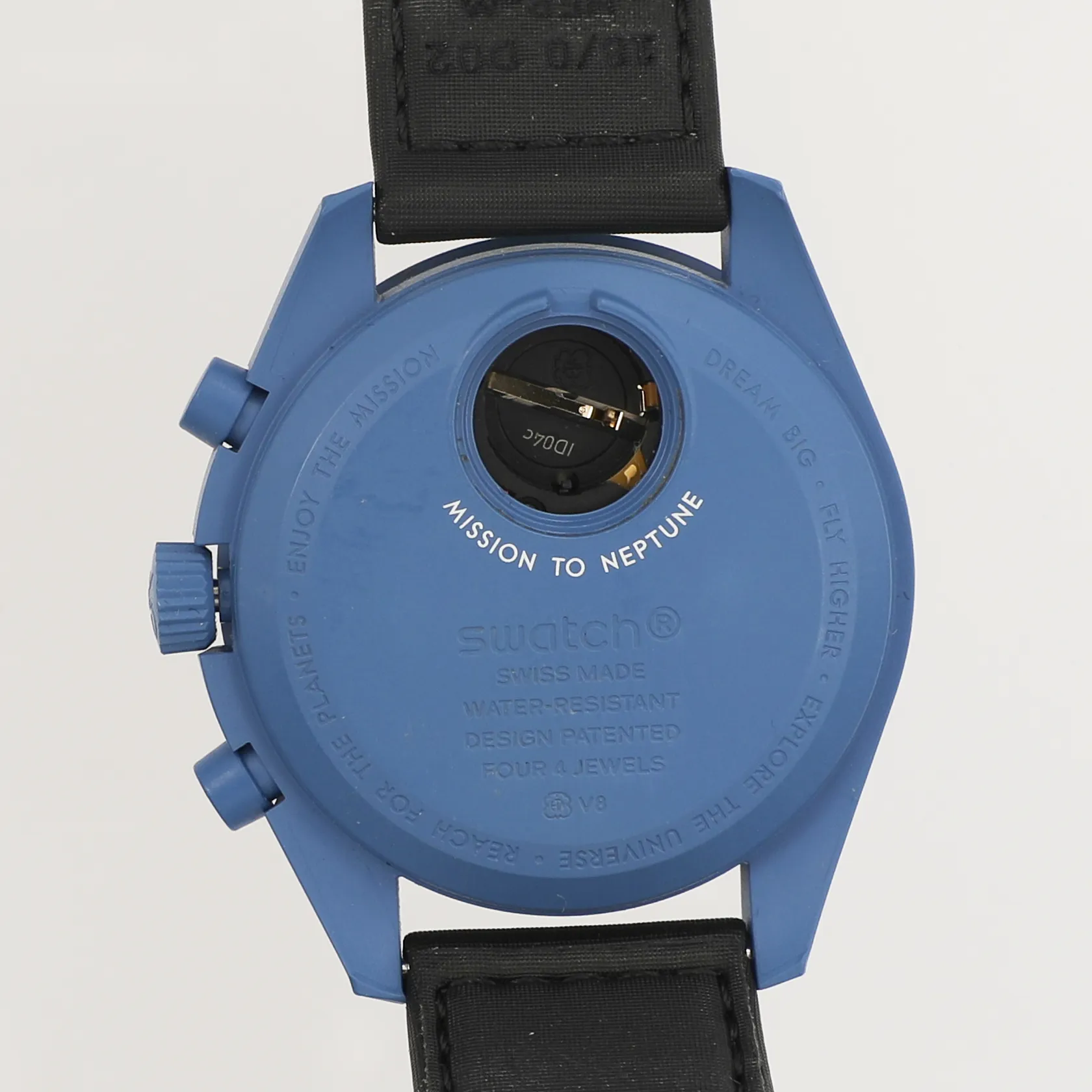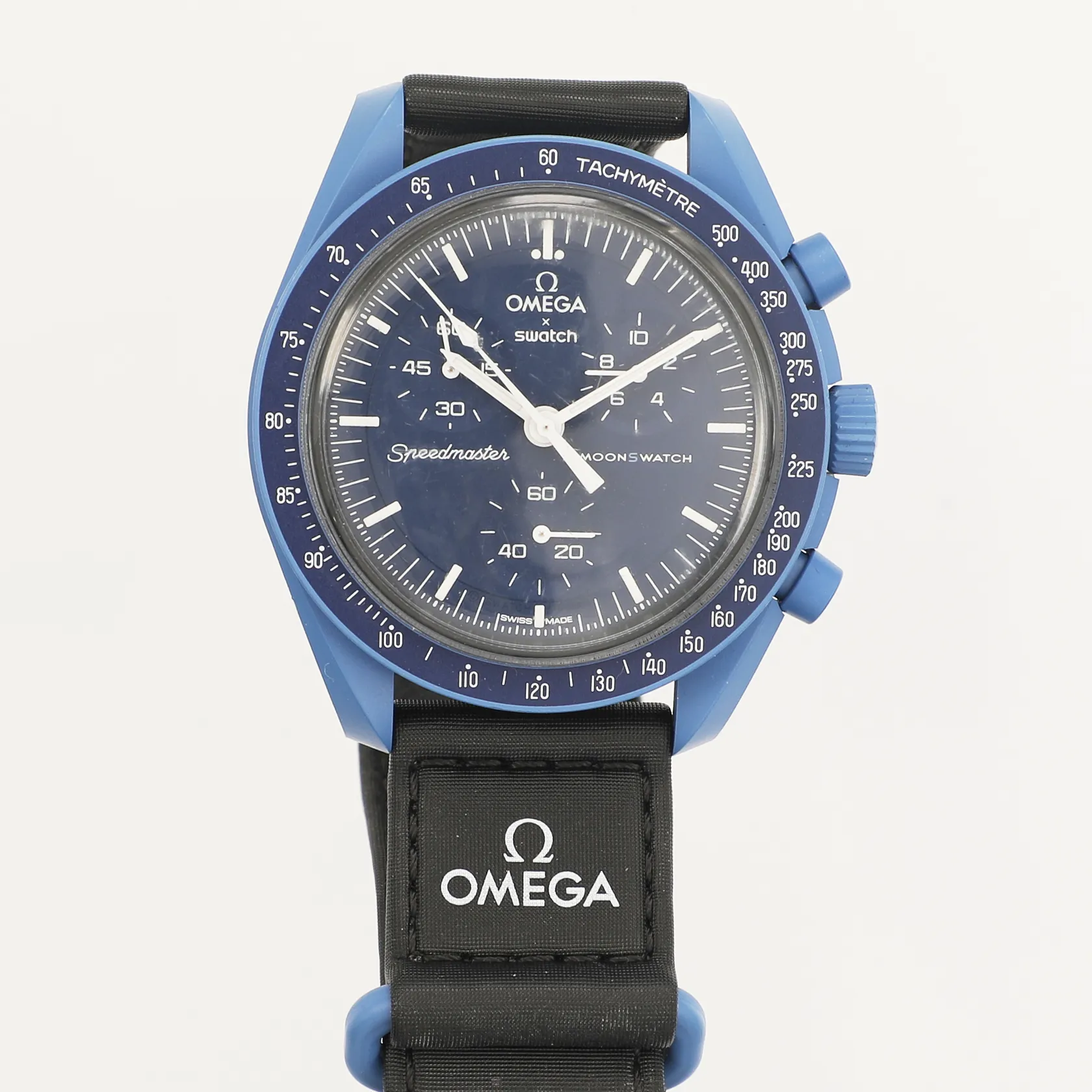 Armbandsur, Swatch/Omega MoonSwatch, Mission to Neptune, bioceramic, quartz, Ø42mm, kronograf, Velcro-band, repigt plexiglas, batterilock saknas, manual, box