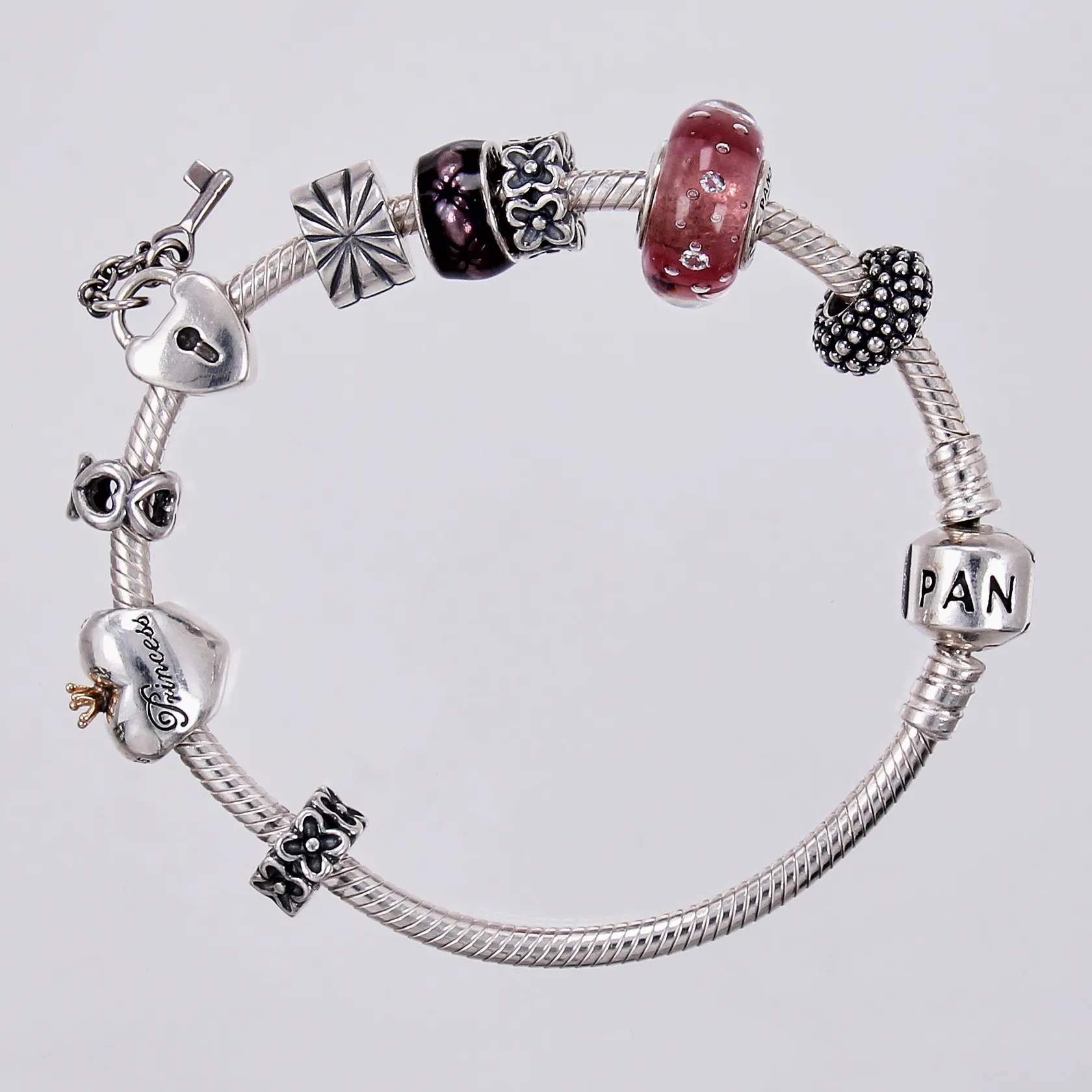 Armband Pandora med 9 berlocker längd: ca 18cm bredd: ca 3-15mm, 925/1000 silver Vikt: 34,9 g.