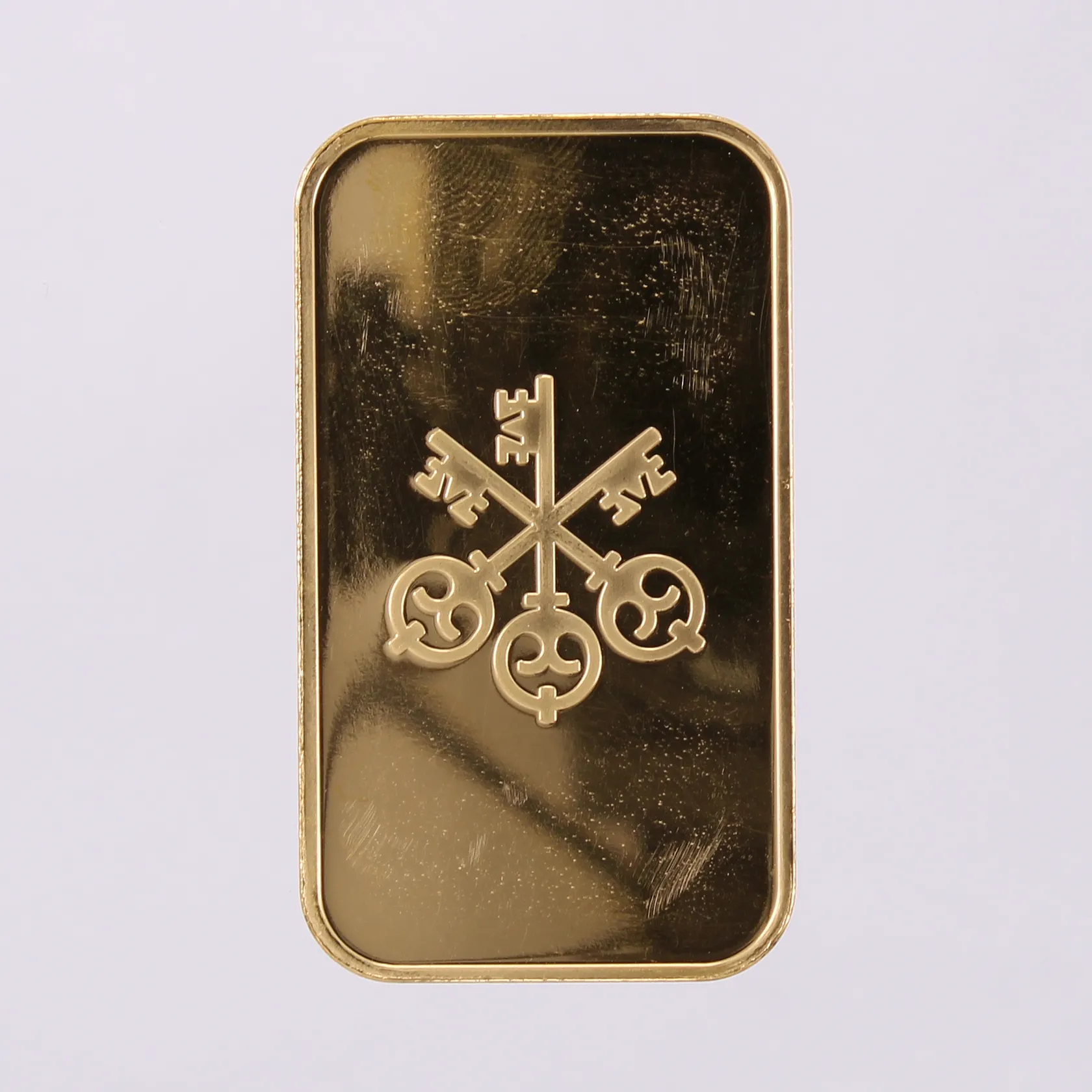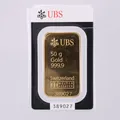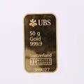 Guldtacka UBS Melter Assayer Switzerland serienummer: 389027 49x28mm, bruten plombering, 24K Vikt: 50 g.