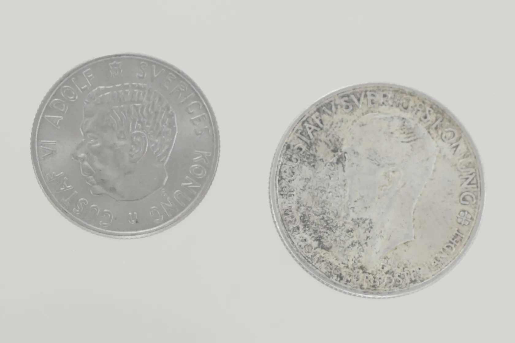 Silvermynt 5kr 1935 90% silver /2kr 1968 ej silver Vikt: 38,3 g.