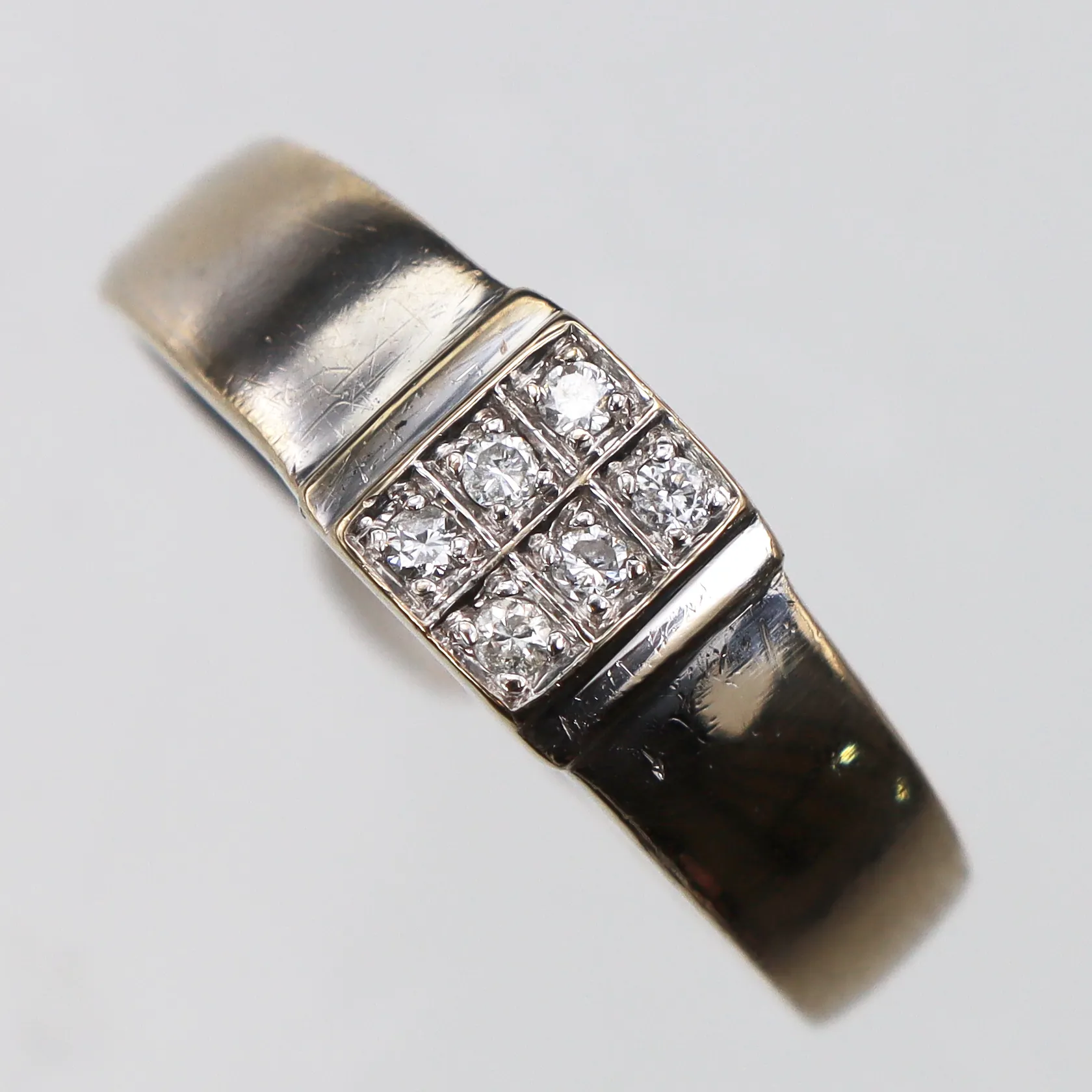 Diamantring ca 6x0,015ct 18k vitguld , storlek 16 ¾ mm,bredd 2.5-6.2 mm. Vikt: 3,3 g.