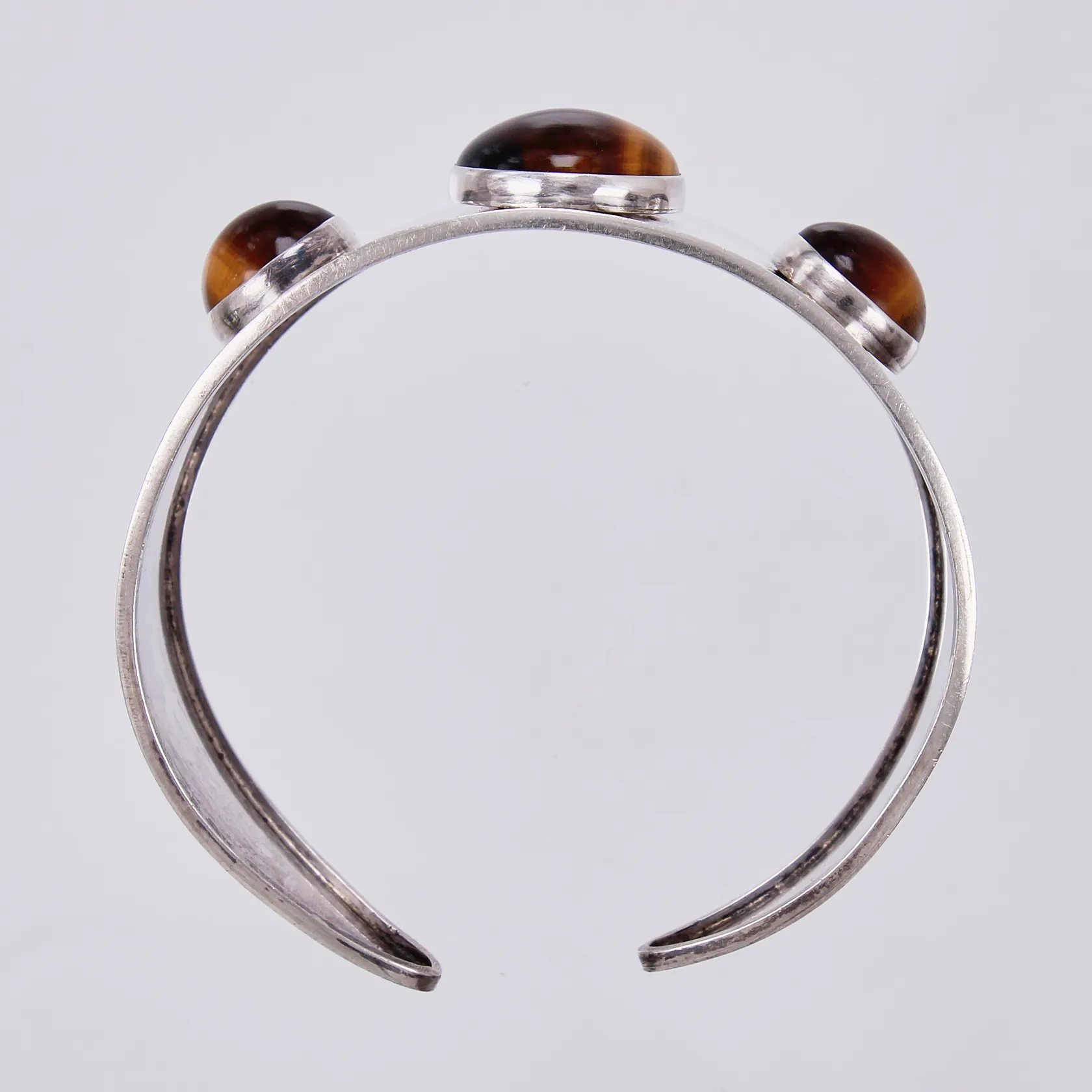 Stelt armband Ø 6cm, bredd ca 5-27mm, med tigeröga, bredd ca Israel 925/1000 silver Vikt: 33,3 g.