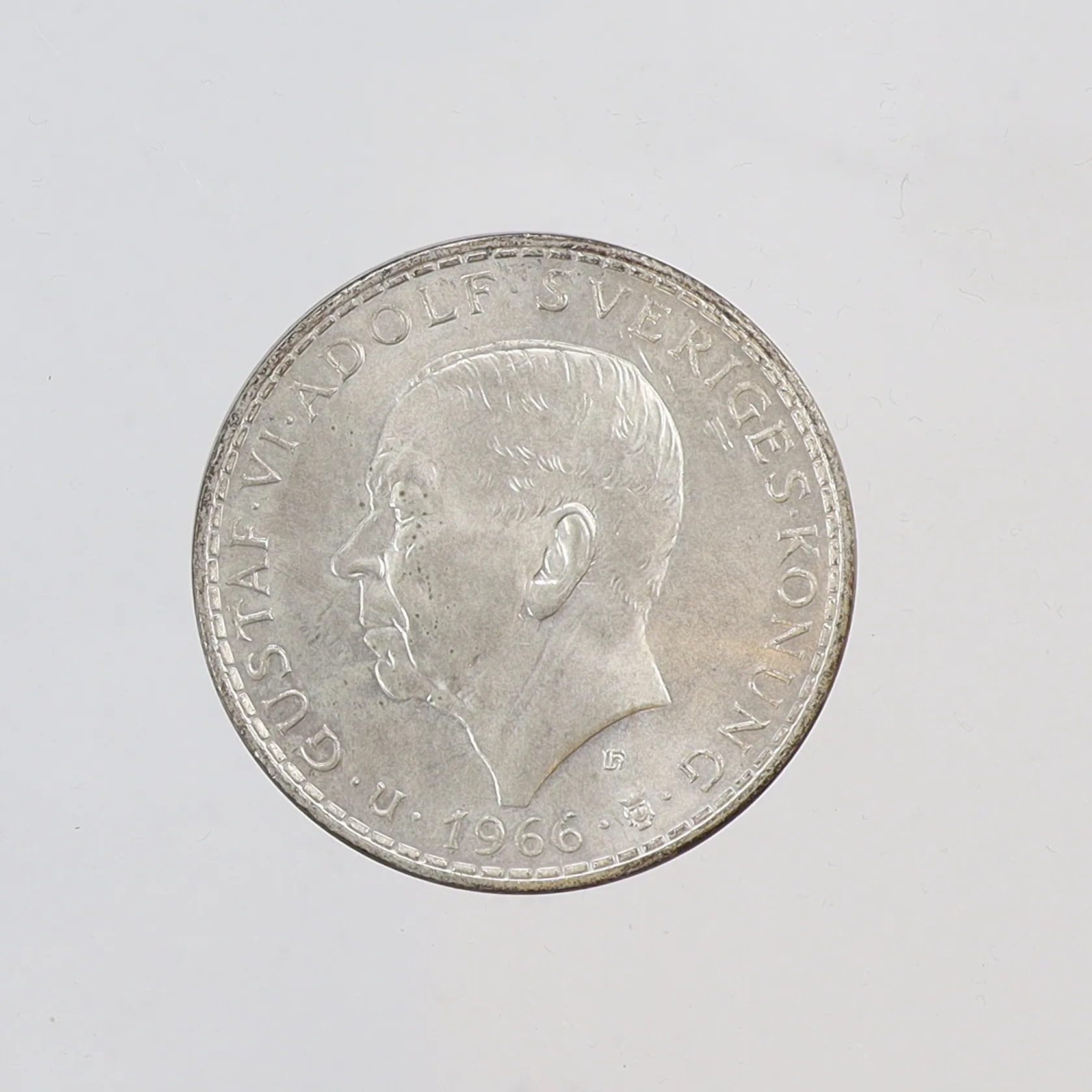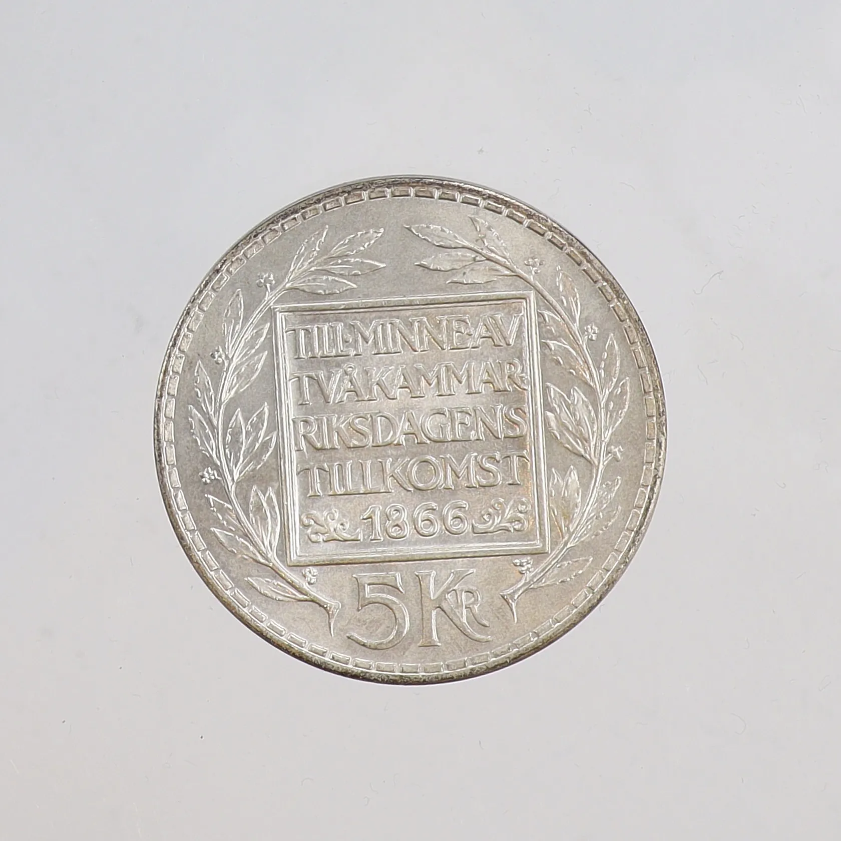 Minnesmynt Gustav VI Adolf 5 kronor 1966 Till Minnet av Tvåkammar-riksdagens Tillkomst 1866 silver 400/1000 Vikt: 18,1 g.