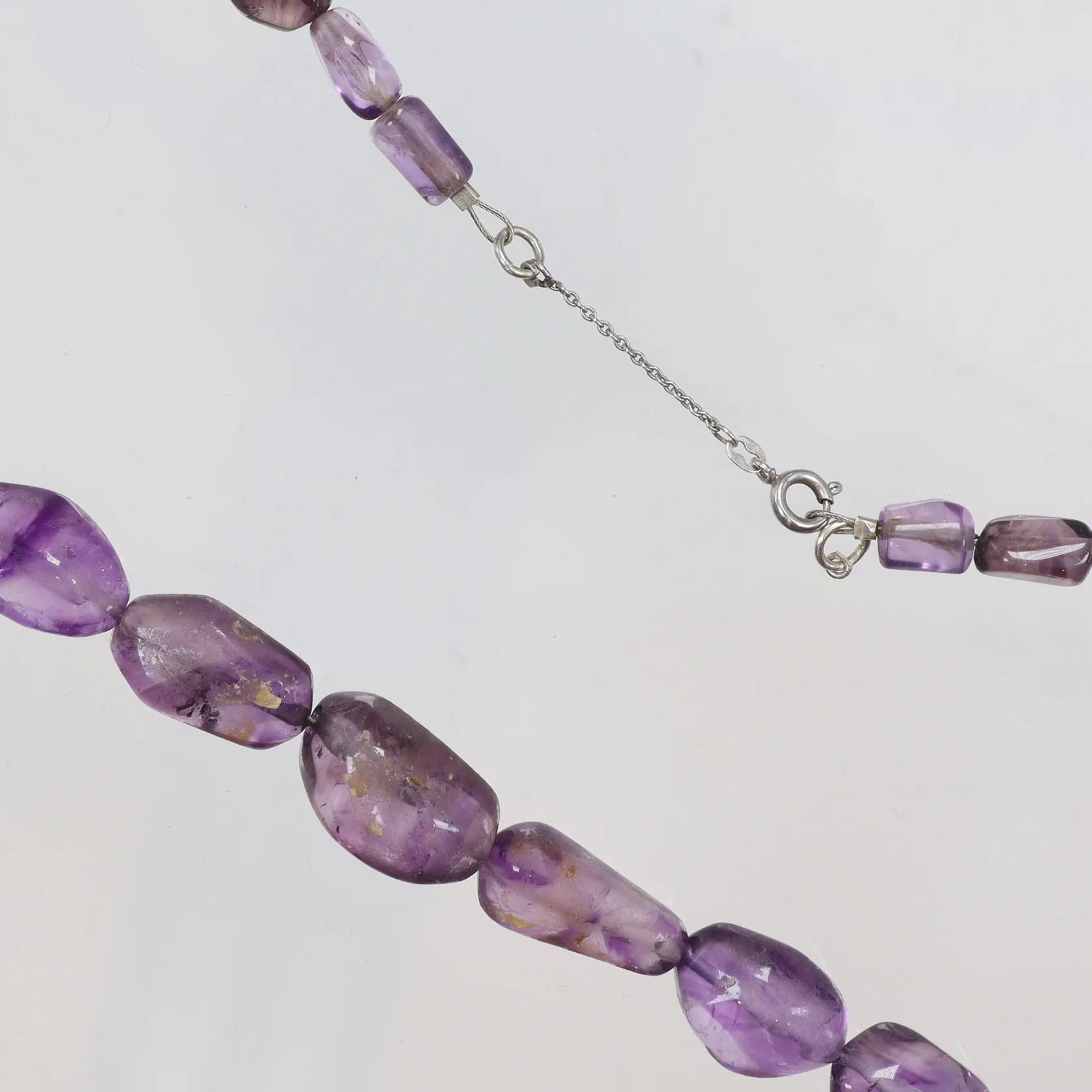 Collier med lila stenar troligen ametister längd 45cm bredd 4--12mm, ställvist hårt slitage, spår av säkerhetskedja men borttagen, lås i silver 935/1000 Vikt: 51,3 g.