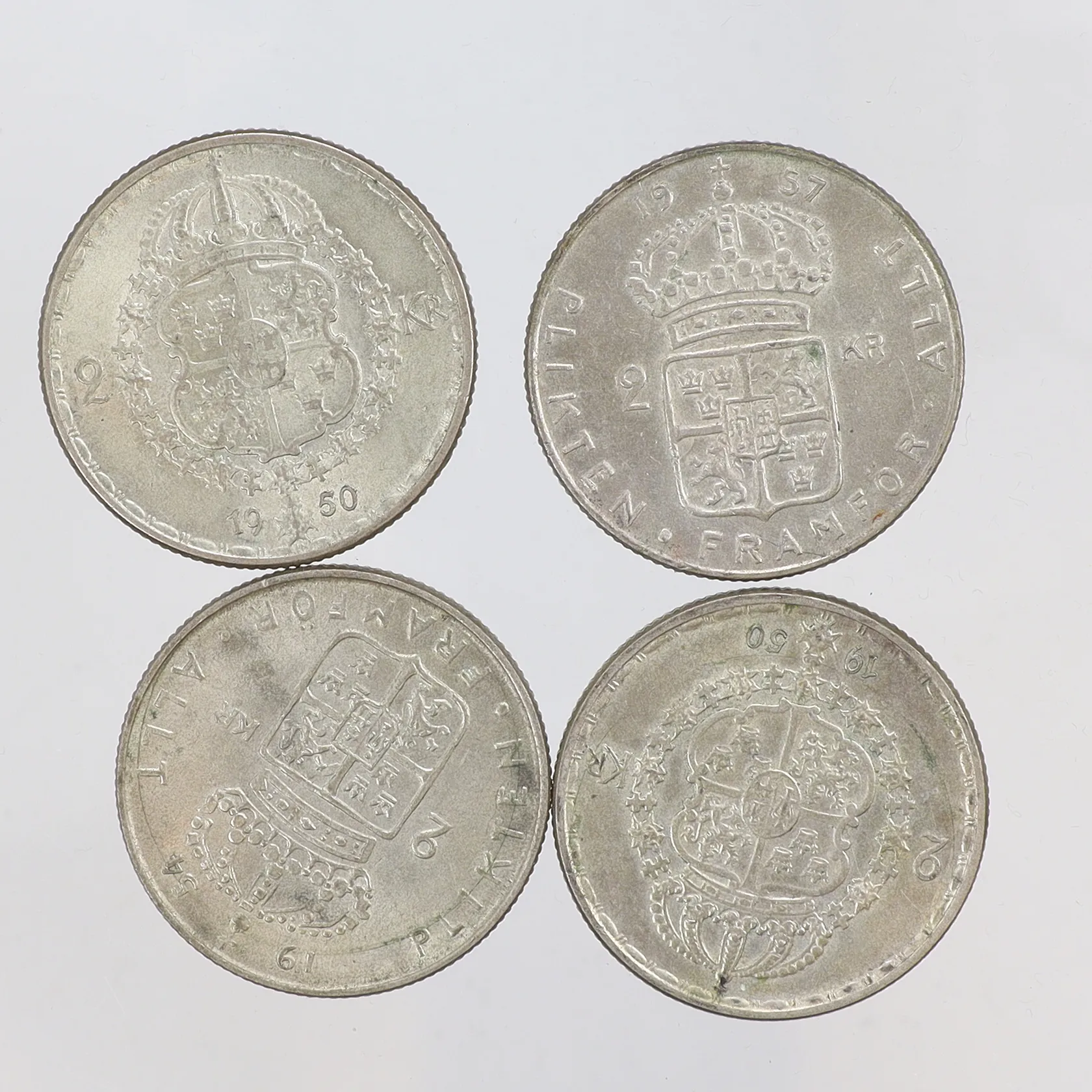 Fyra tvåkronor, 1950, 1954,1957, silver, 400/1000 Vikt: 55,8 g.