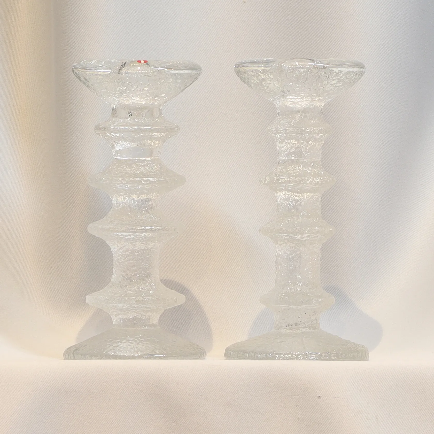 Ett par ljusstakar ur serien "Festivo", formgiven av Timo Sarpaneva för Iittala, höjd: 18,5cm etikettmärkta, klarglas Skickas med postpaket.