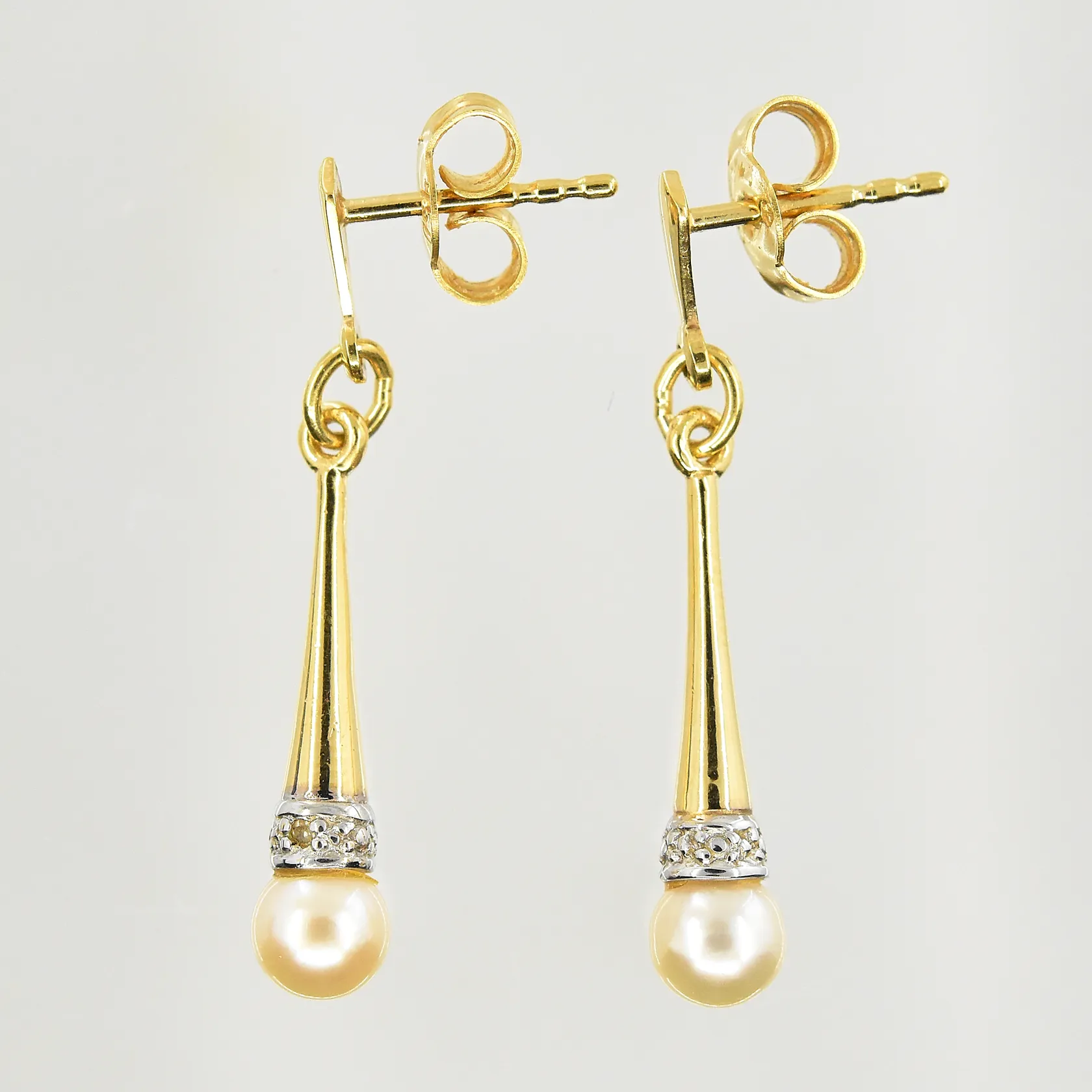 Ett par örhängen med odlade sötvattenpärlor, Ø5 mm, längd 30 mm, gulguld/vitguld, 18K. Vikt: 2,5 g.