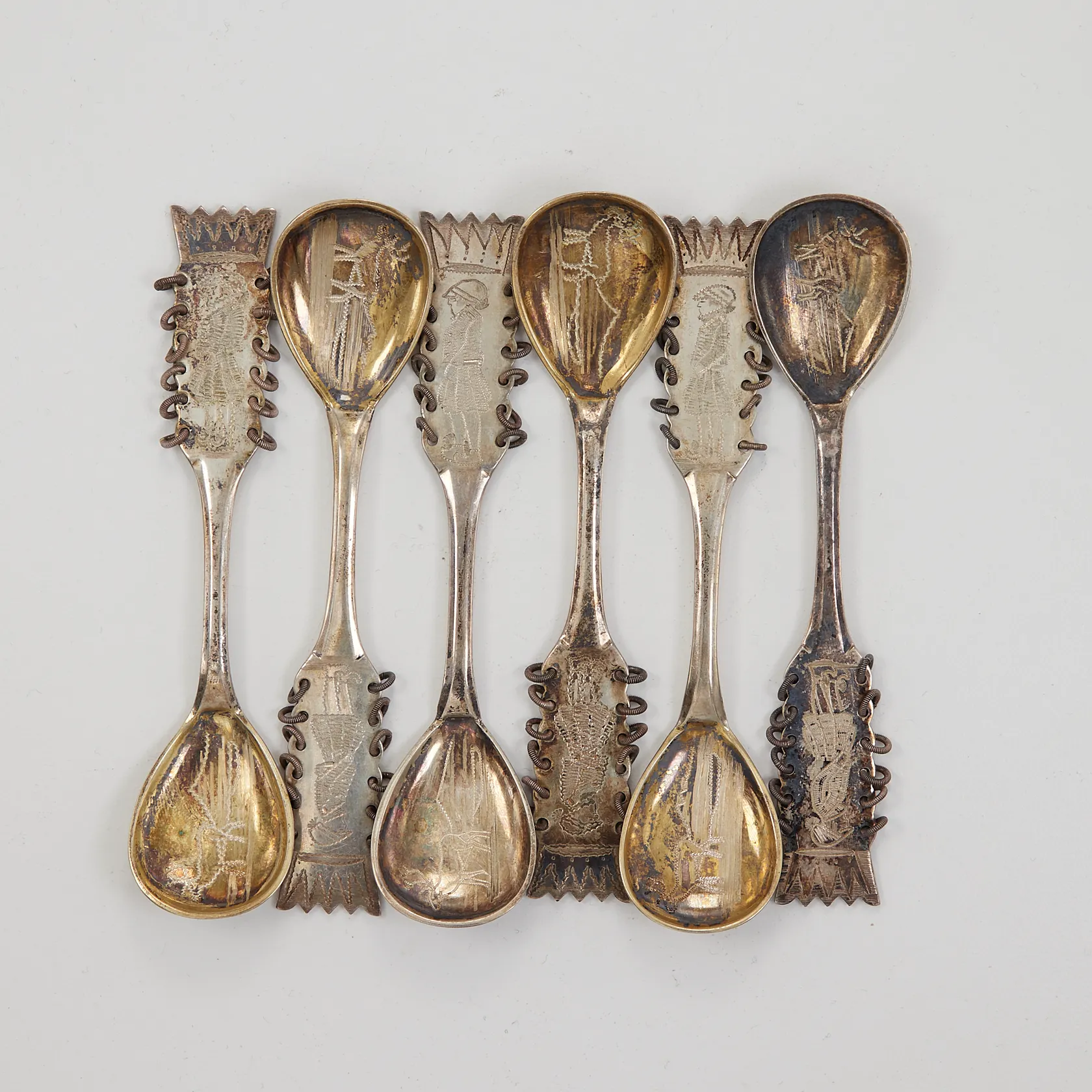 6 Sameskedar, ca 11cm, slitna, K&EC Silver 830/1000, Vikt: 81,9 g.