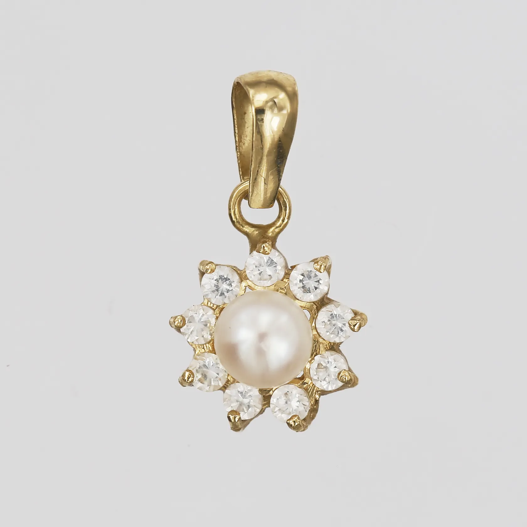 Hänge med pärla och vita stenar, längd 16mm inklusive ögla, bredd 9mm, 18K Vikt: 0,6 g.