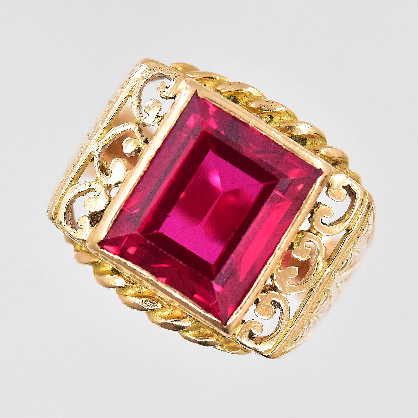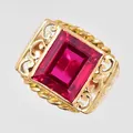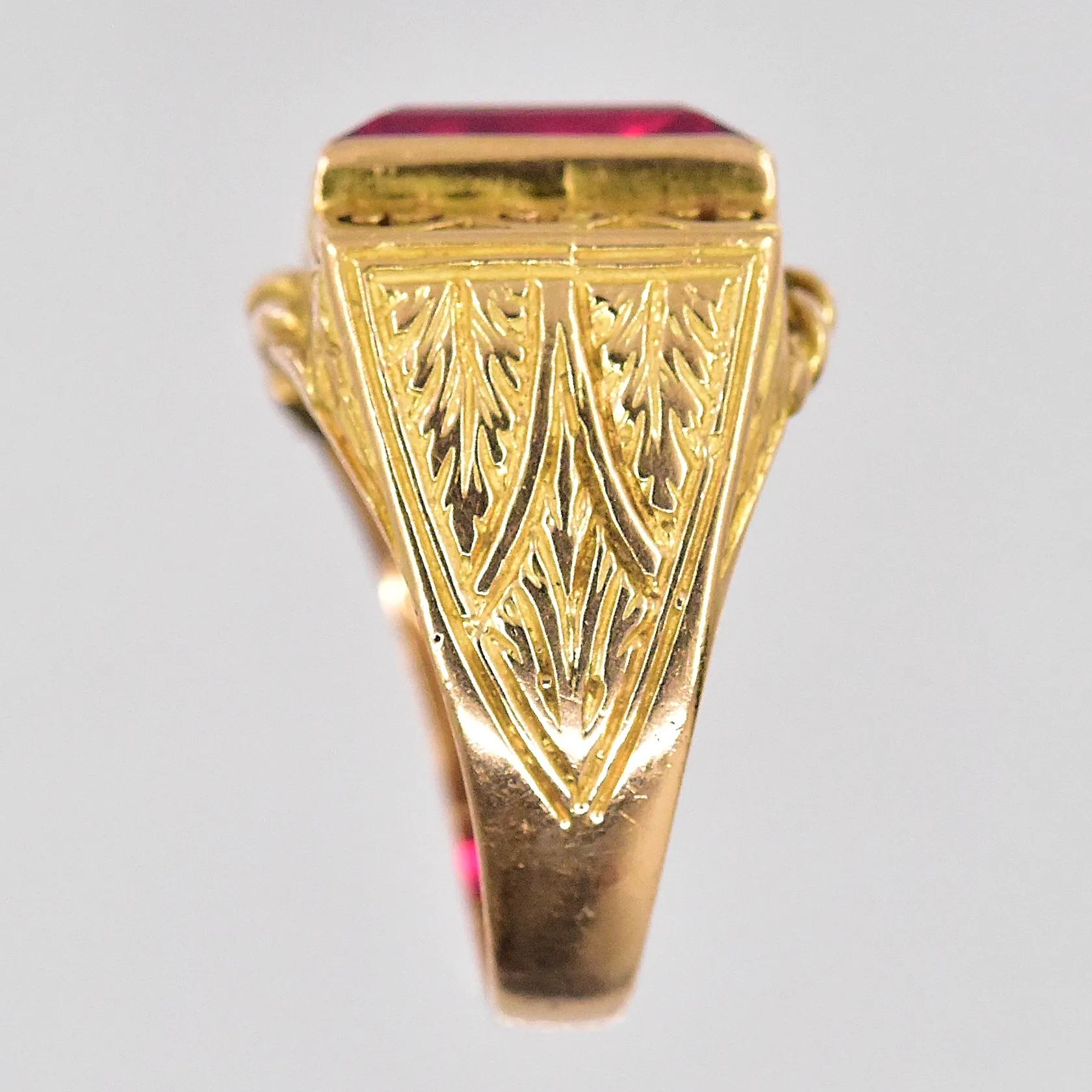 Klackring med röd sten stl:19, ovandel bredd 16,7mm 18K Vikt: 8,7 g.