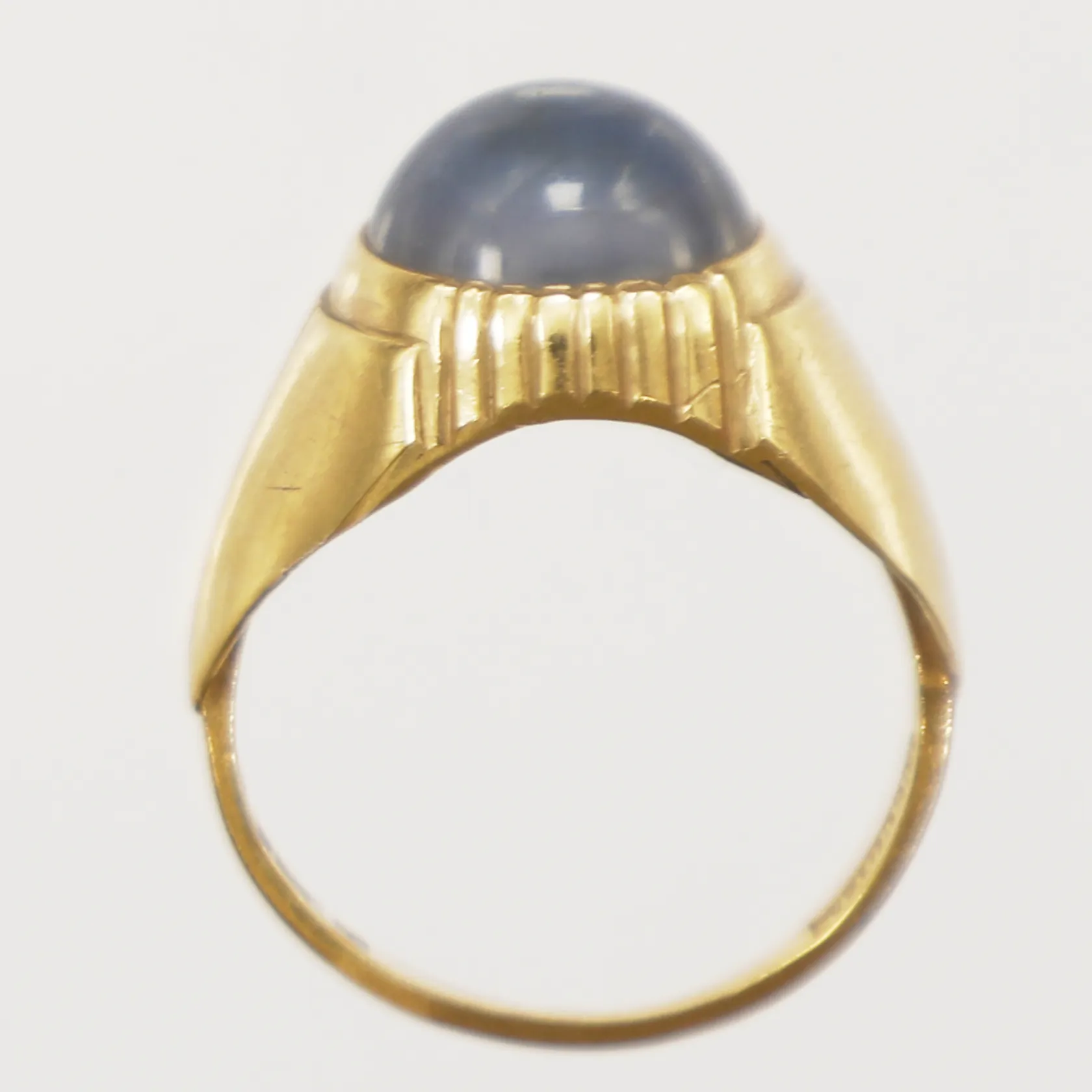 Ring med blå kalcedon, stl 17, bredd 0,8-12,1mm, Stigbert, 18K Vikt: 3,8 g.
